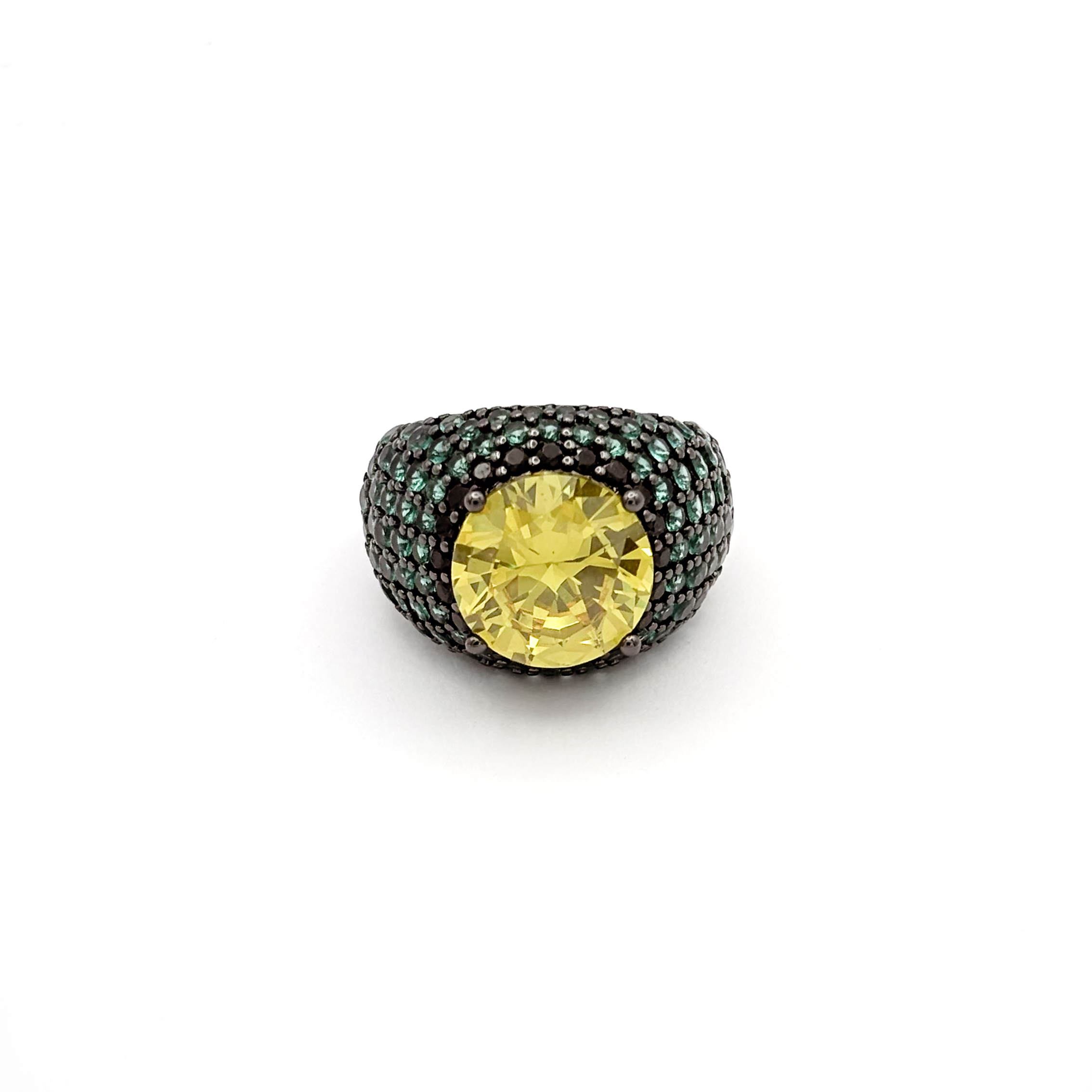 Aggiungi al carrello Anello in argento 925 nero con pietra idrotermale gialla, giro di zirconi neri e pavé di zirconi verdi € 150,00
