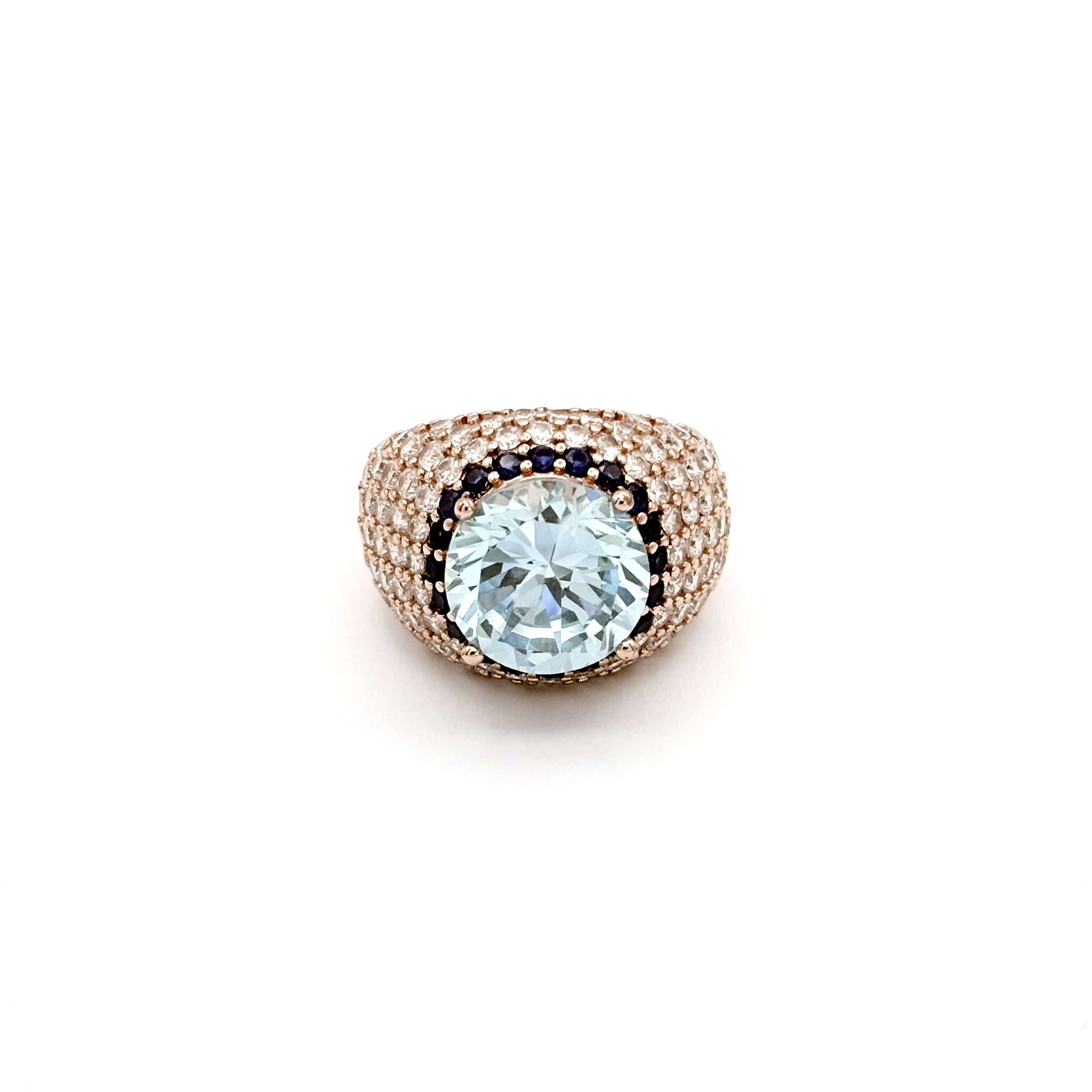 Aggiungi al carrello Anello in argento 925 rosato con pietra idrotermale azzurra, giro di zirconi blu e pavé di zirconi bianchi € 150,00