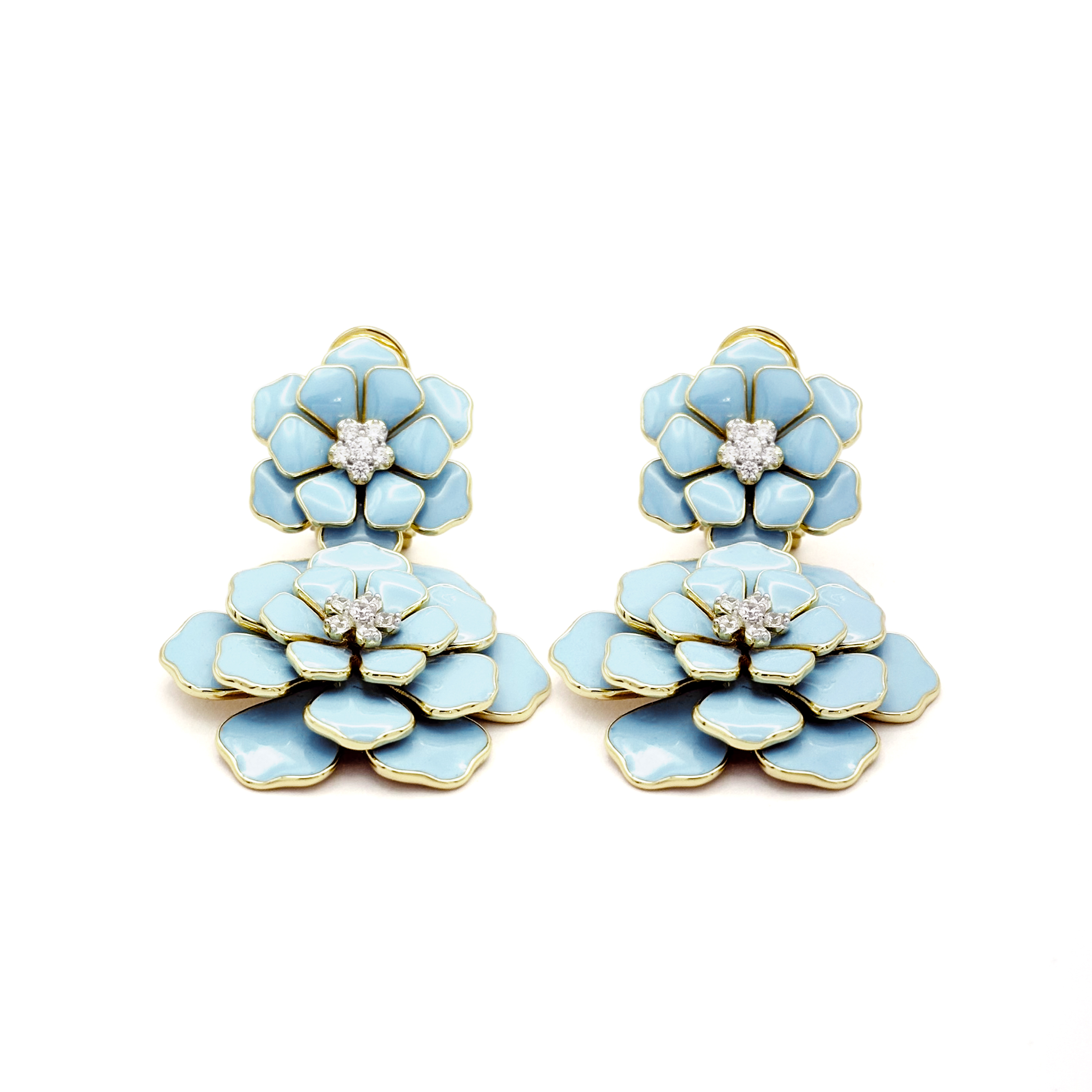 Aggiungi al carrello Orecchini pendenti a fiore in argento 925 dorato con smalto azzurro e zirconi € 220,00