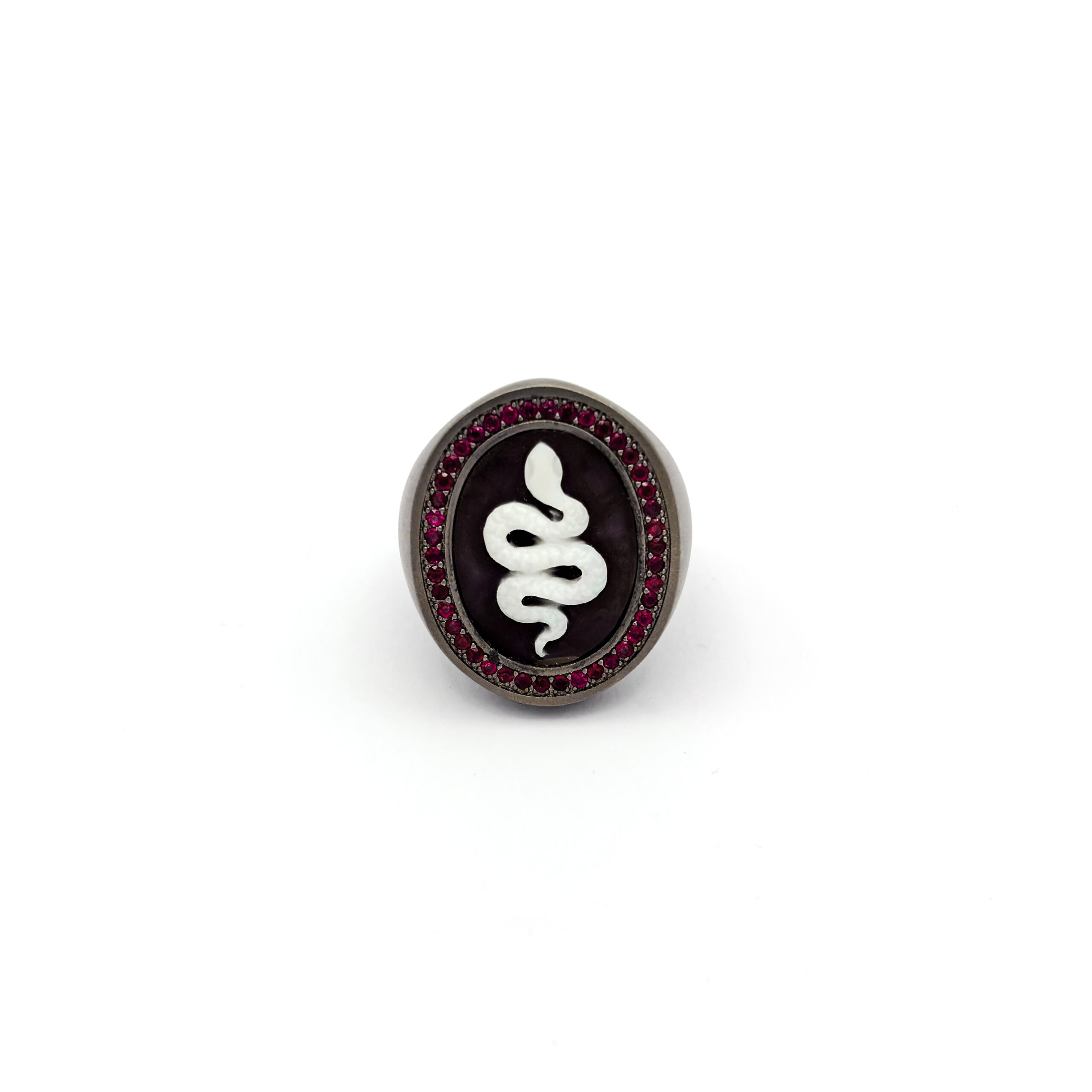 Aggiungi al carrello Anello chevalier “Nova” in titanio con cammeo peperoncino e rubini 0,34 ct – Mano|J. € 485,00
