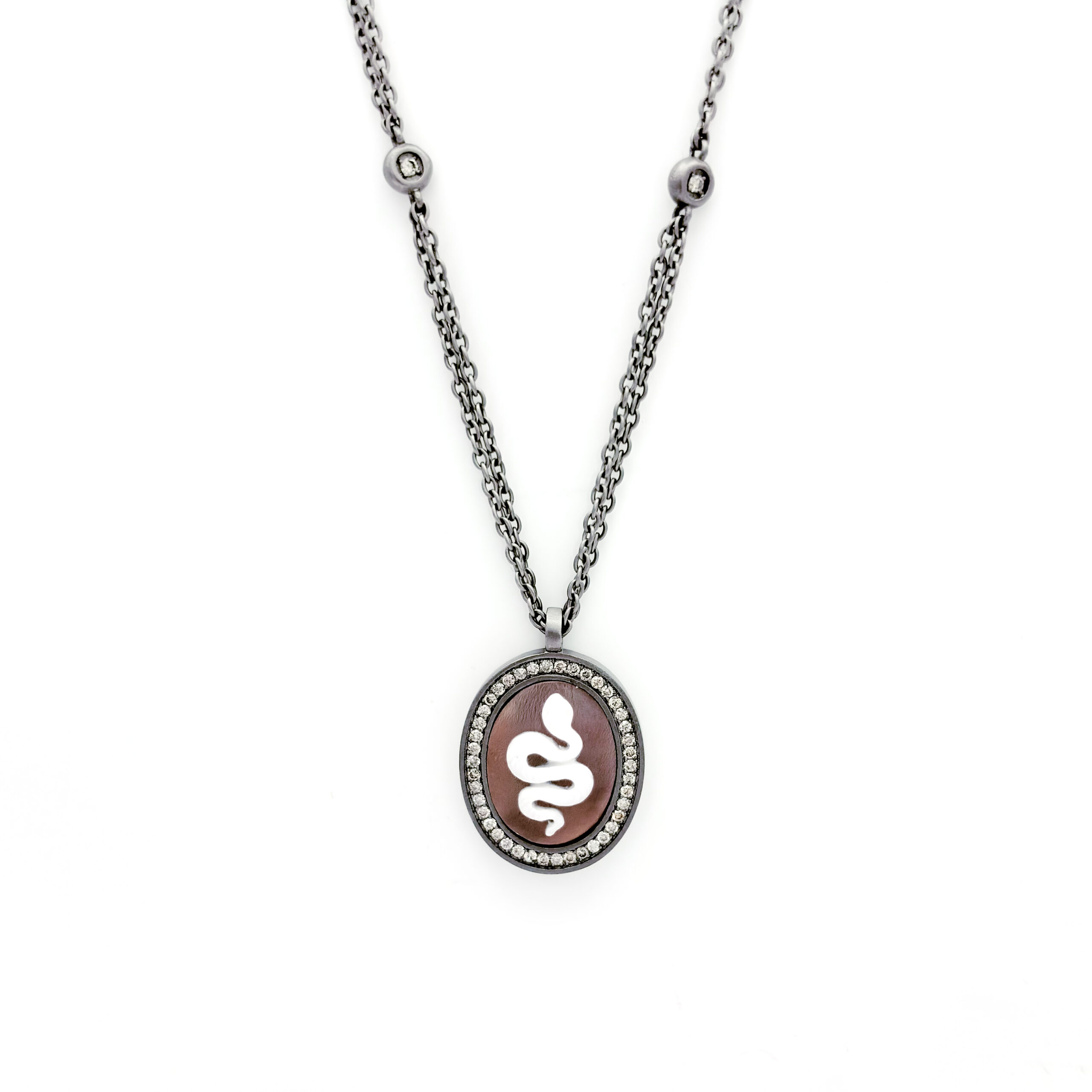 Aggiungi al carrello Collana “Nova” in titanio con pendente cammeo serpente con diamanti Brown – Mano|J. € 1.190,00