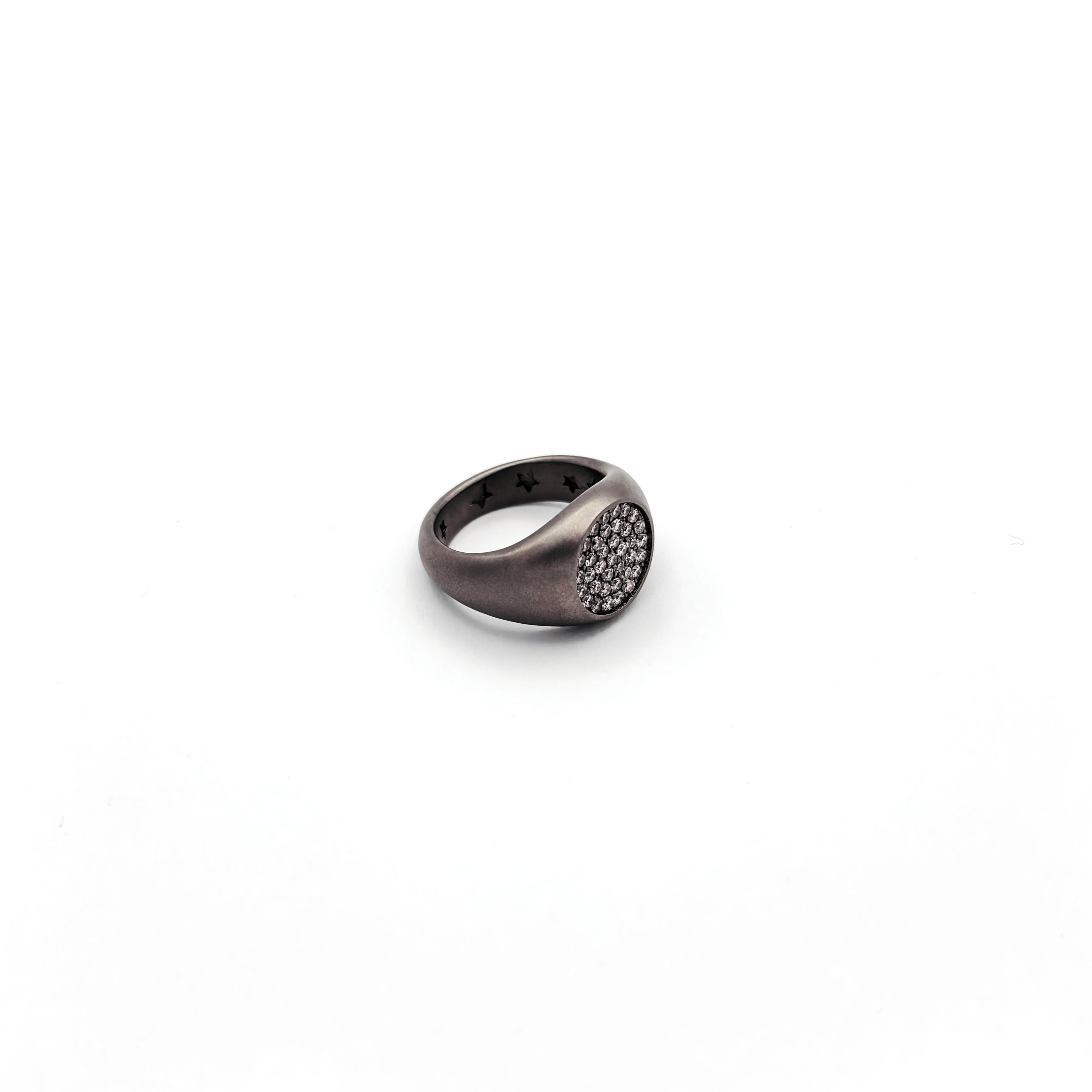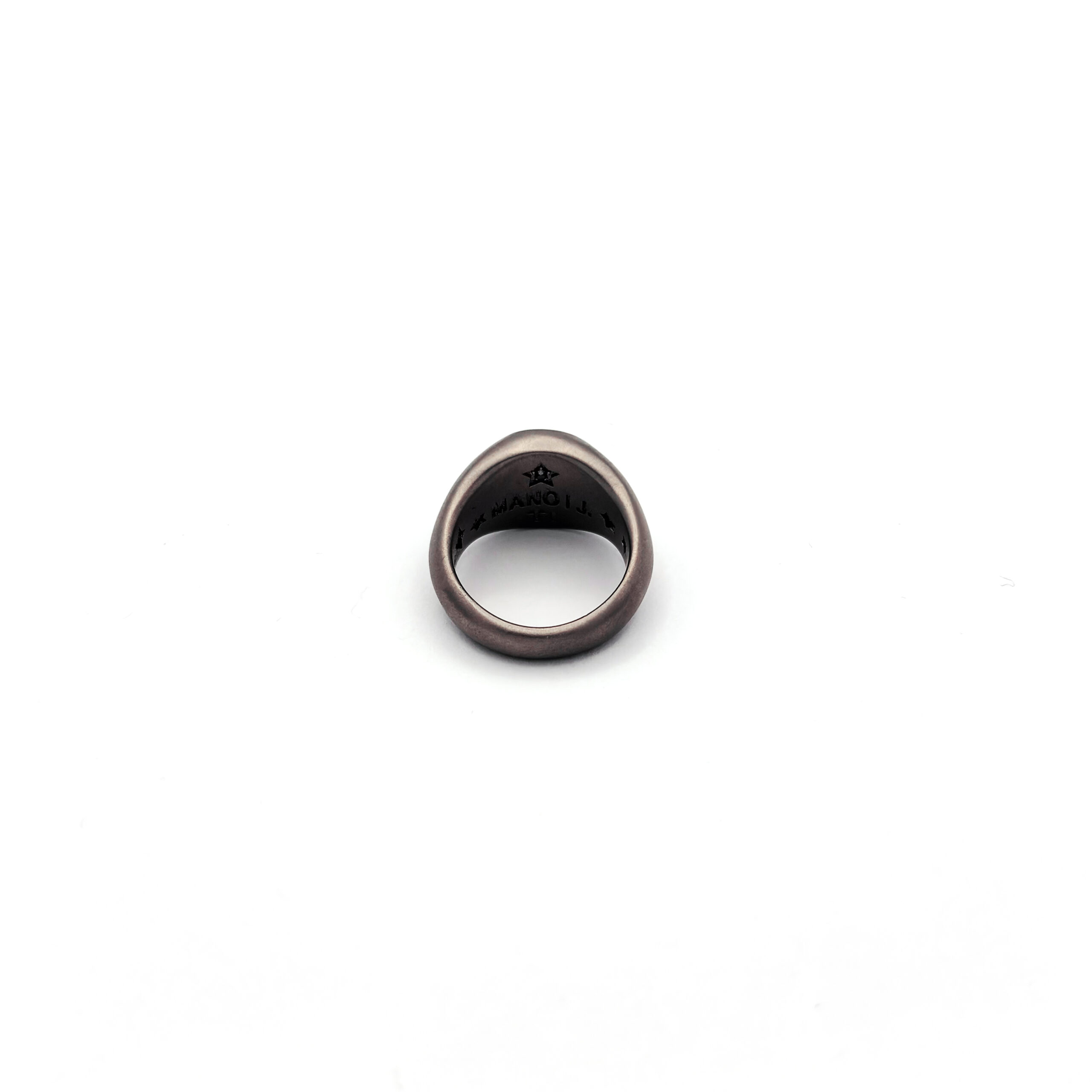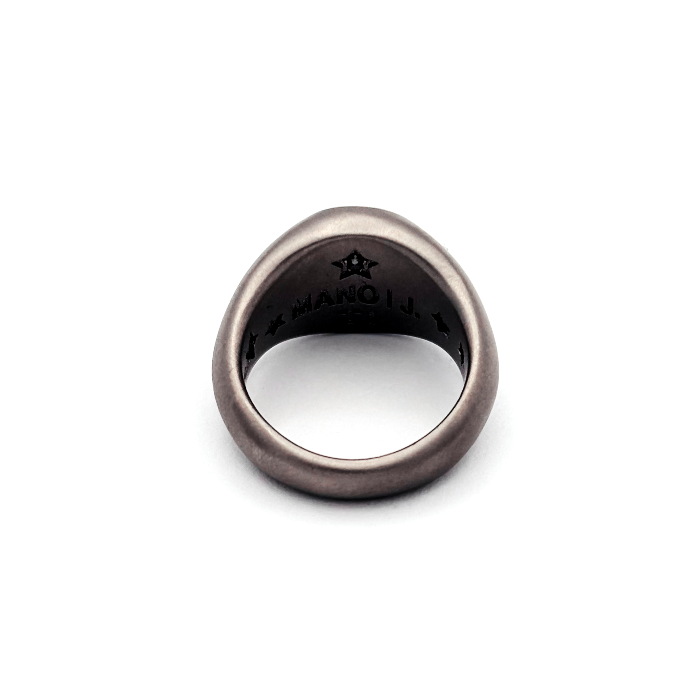 L’anello Chevalier Mano|J. reinterpreta un classico con una sensibilità contemporanea: titanio dal finish opaco e una superficie frontale illuminata da un pavé fitto di diamanti brown, dalla luce calda e sofisticata. Un piccolo diamante black aggiunge un tocco grafico, come una firma discreta. Le linee morbide e pulite lo rendono importante al dito ma sempre elegante, perfetto per chi ama gioielli di carattere, essenziali e premium.