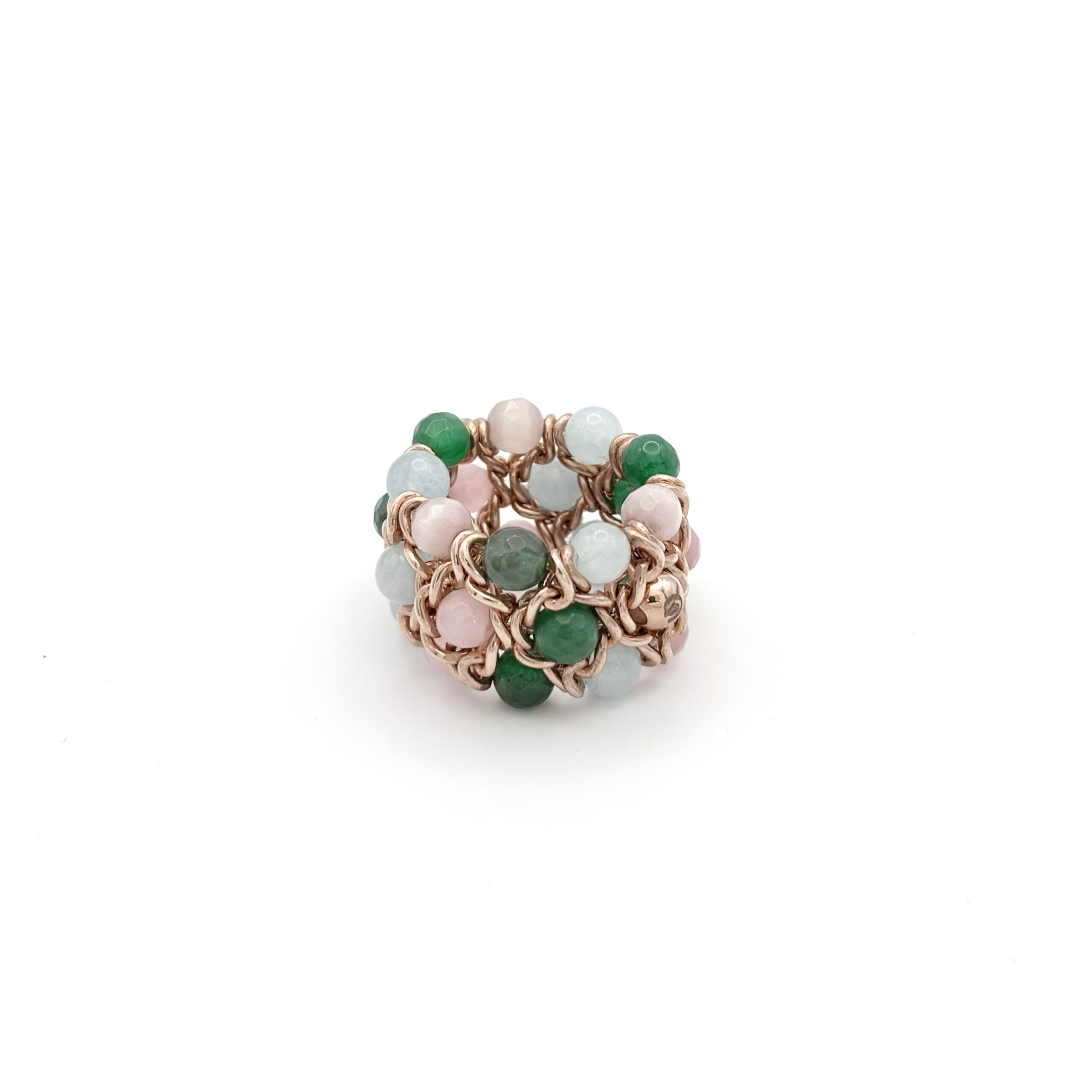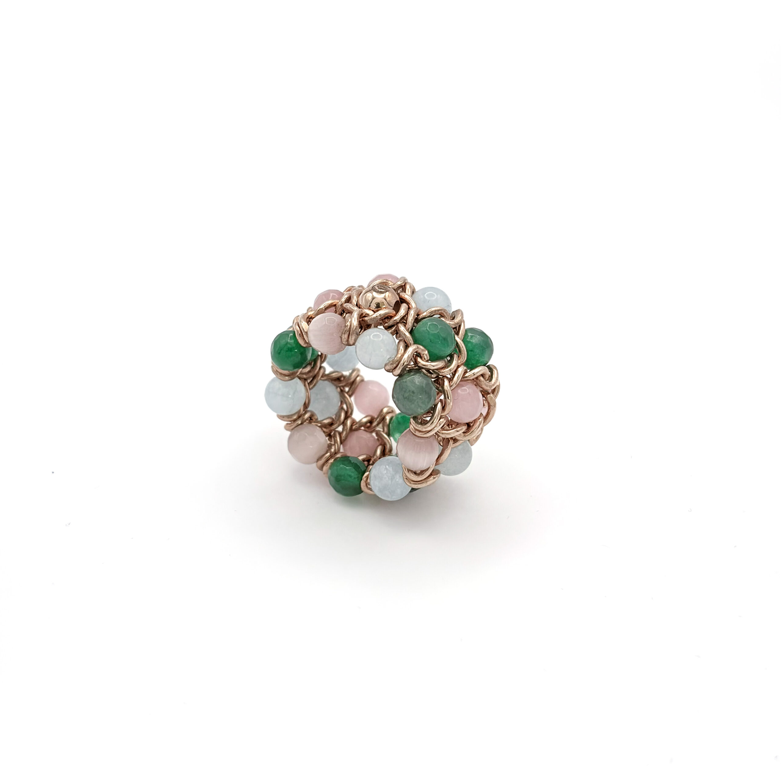 Un anello elastico dal carattere couture: una maglia intrecciata color oro rosa abbraccia una sequenza di pietre naturali in verde, azzurro e rosa cipria. Il design a rete crea volume e luce, mantenendo una vestibilità sorprendentemente comoda. Si indossa in un gesto e si adatta alla mano con naturalezza, diventando subito il dettaglio che valorizza anche l’outfit più essenziale.