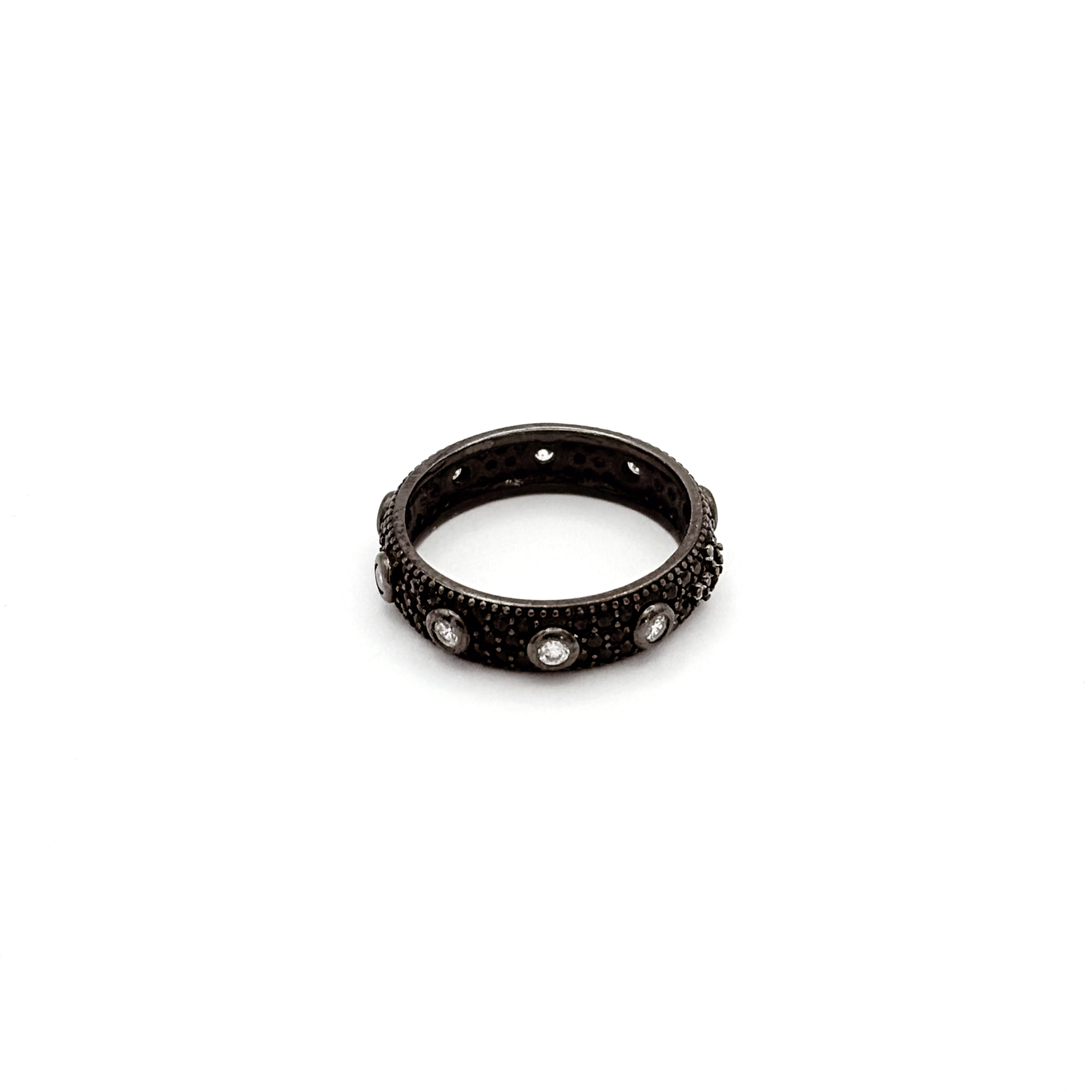 Un anello in argento 925 dalla personalità decisa, rifinito con effetto nero e illuminato da zirconi incastonati. La forma a fascia, compatta e contemporanea, è arricchita da una texture puntinata che crea profondità , mentre le pietre – distribuite lungo il giro – aggiungono riflessi puliti e regolari. Sul fronte, un piccolo motivo a croce in zirconi diventa un dettaglio grafico, discreto ma riconoscibile. È il gioiello perfetto per chi ama l’argento scuro e i contrasti: forte, elegante, facile da abbinare.