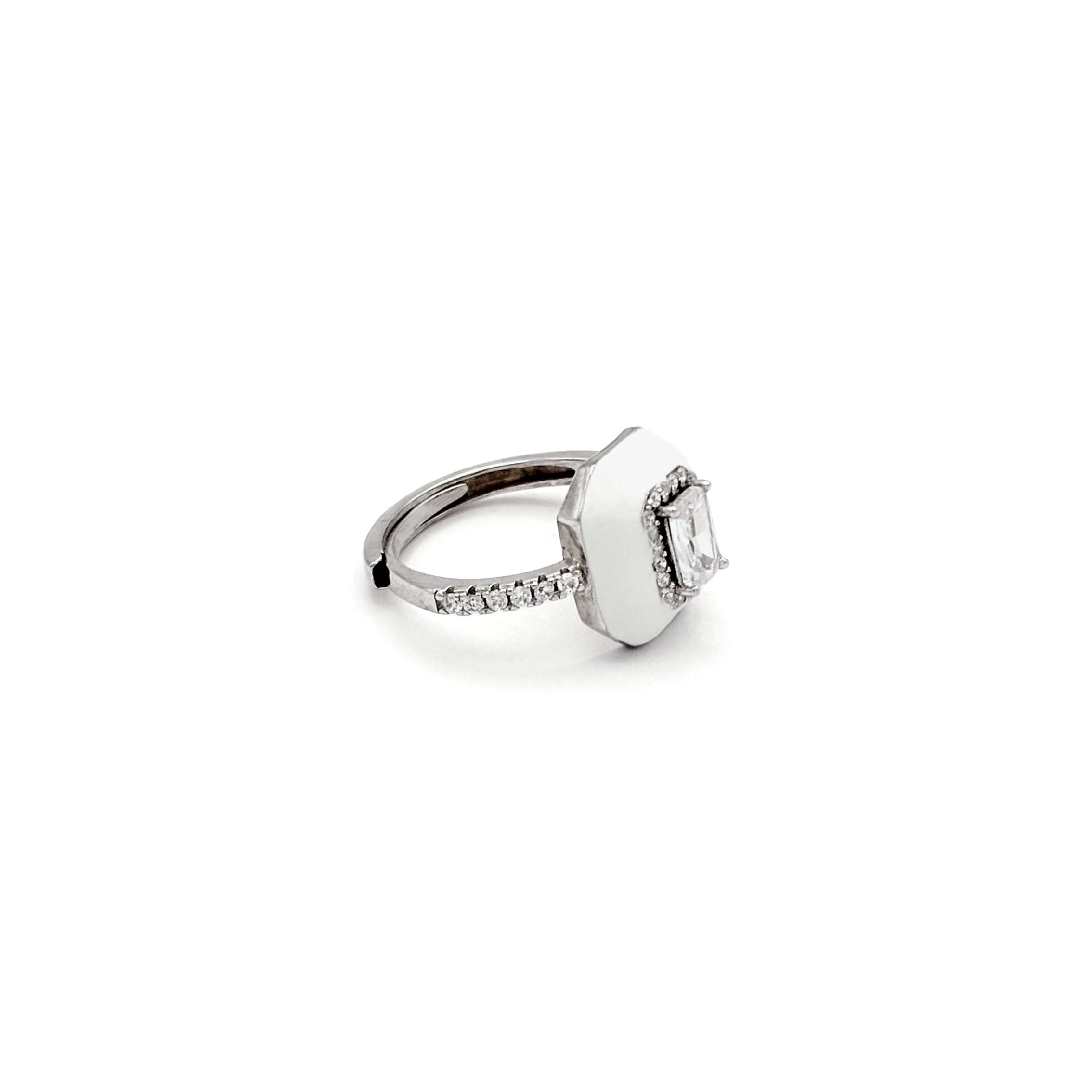 Smalto bianco, forma ottagonale e zirconi luminosi: un anello in argento 925 essenziale ma d’impatto. Regolabile, perfetto anche come regalo.