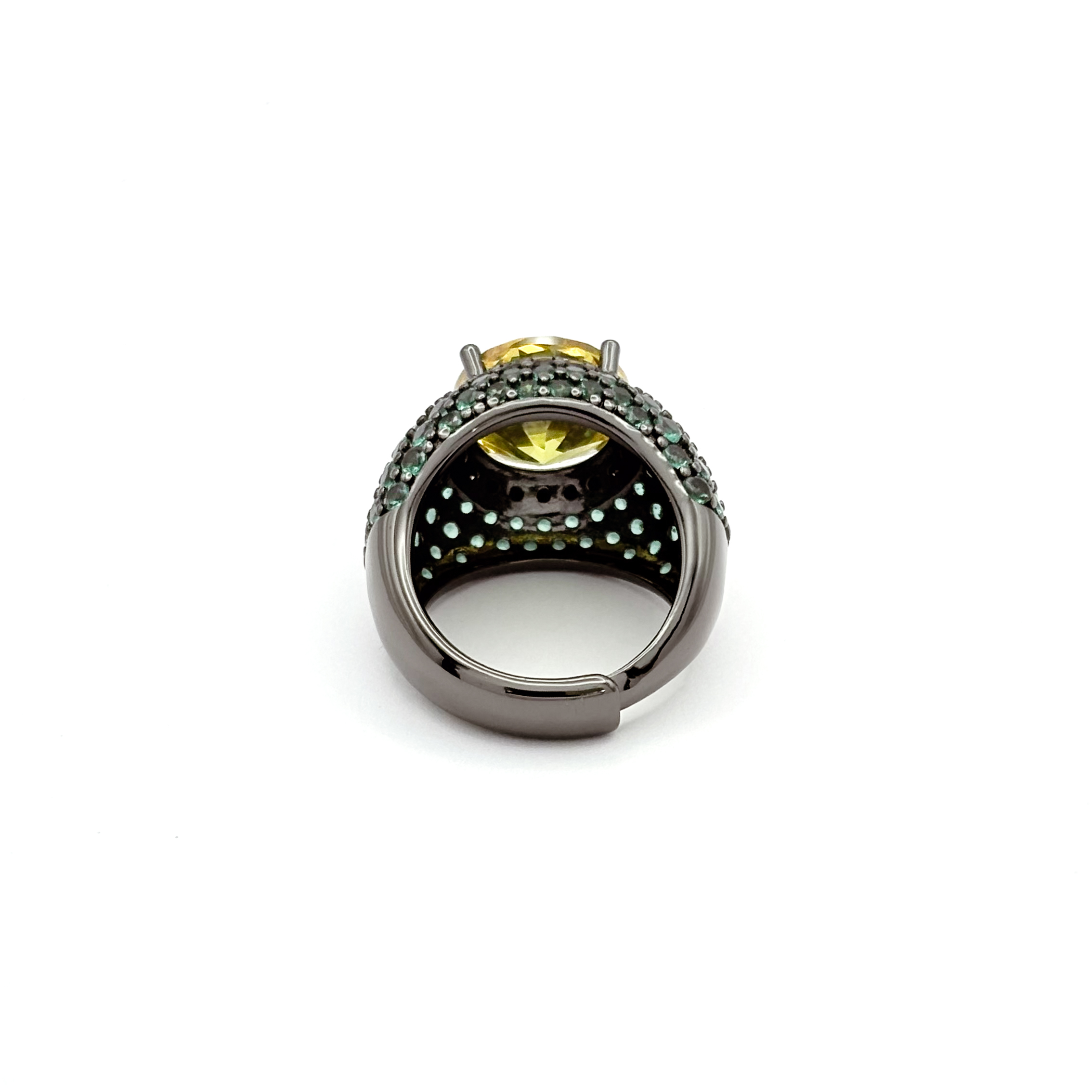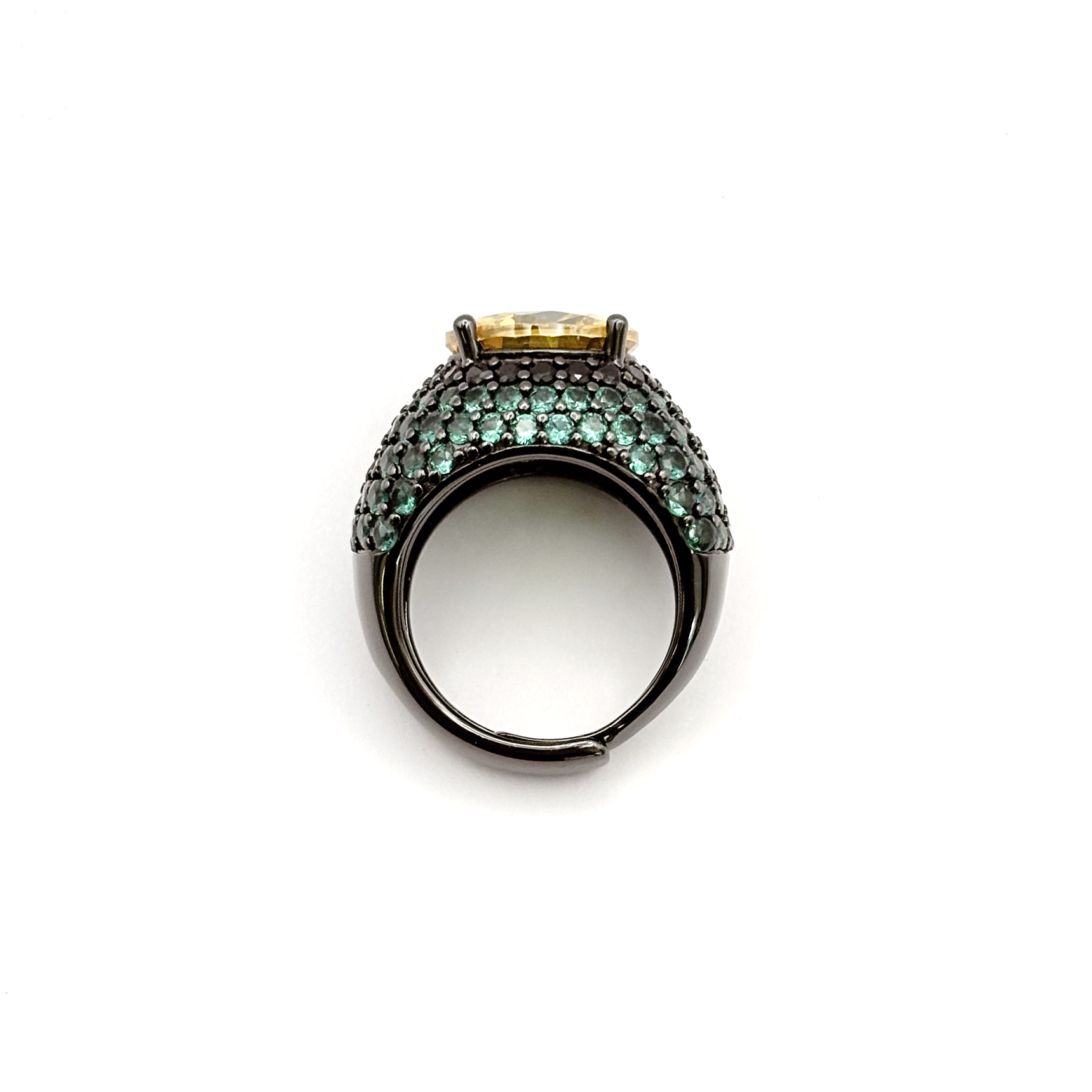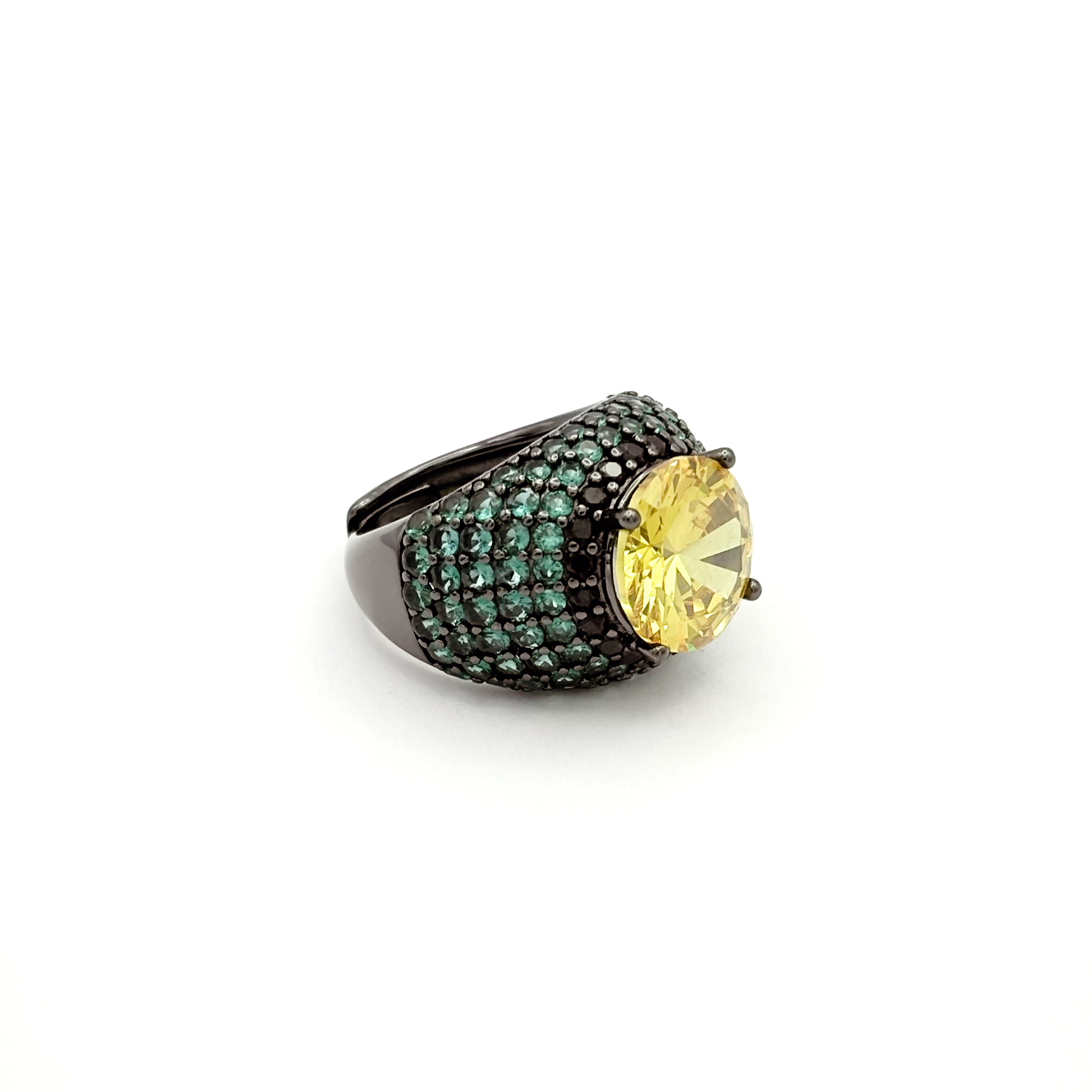 Realizzato in argento 925 con finitura nera, ospita una pietra idrotermale gialla protagonista e una pavé di zirconi verdi che riveste la montatura come una texture luminosa.
