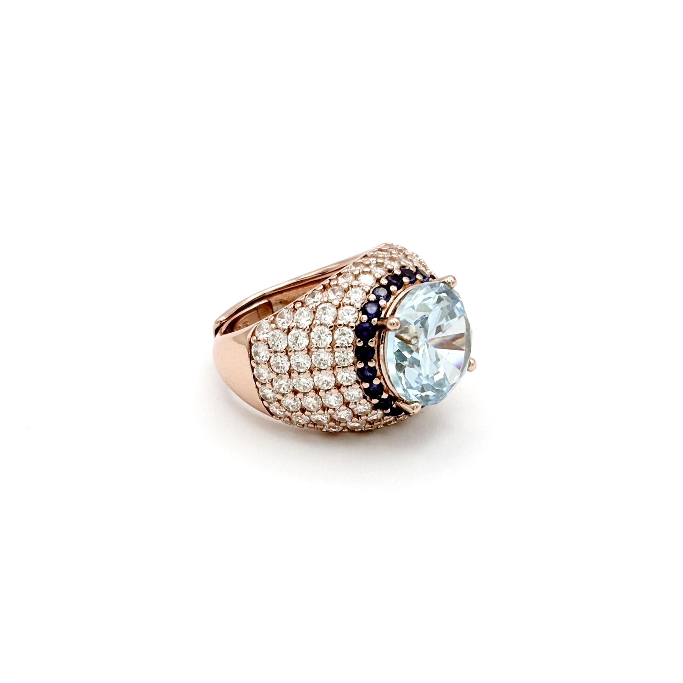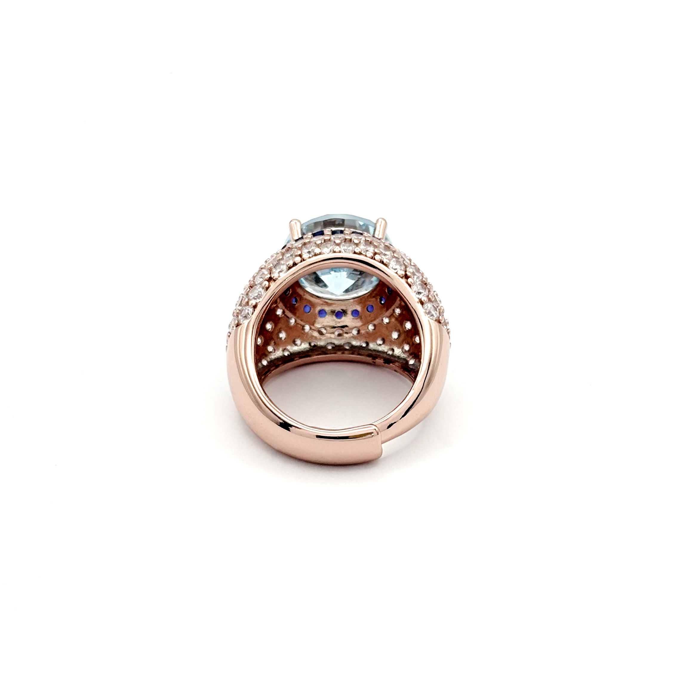 Argento 925 rosato, pietra idrotermale azzurra centrale, giro di zirconi blu e pavé di zirconi bianchi.