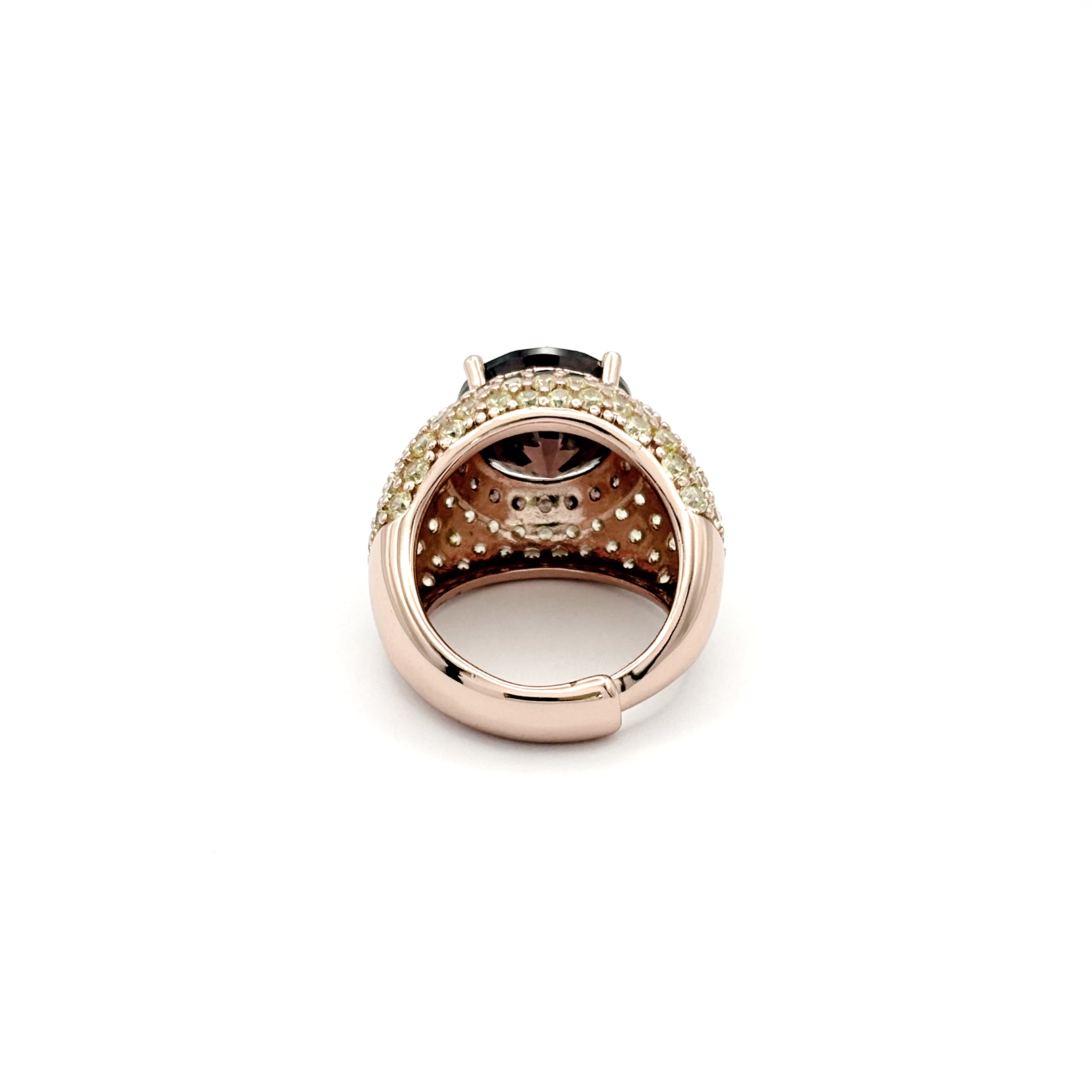 Incastonatura a pavé fitta e regolare; cornice di zirconi bruni per un contrasto deciso; pietra centrale sostenuta da griffe per massimizzare luce e pulizia del profilo.