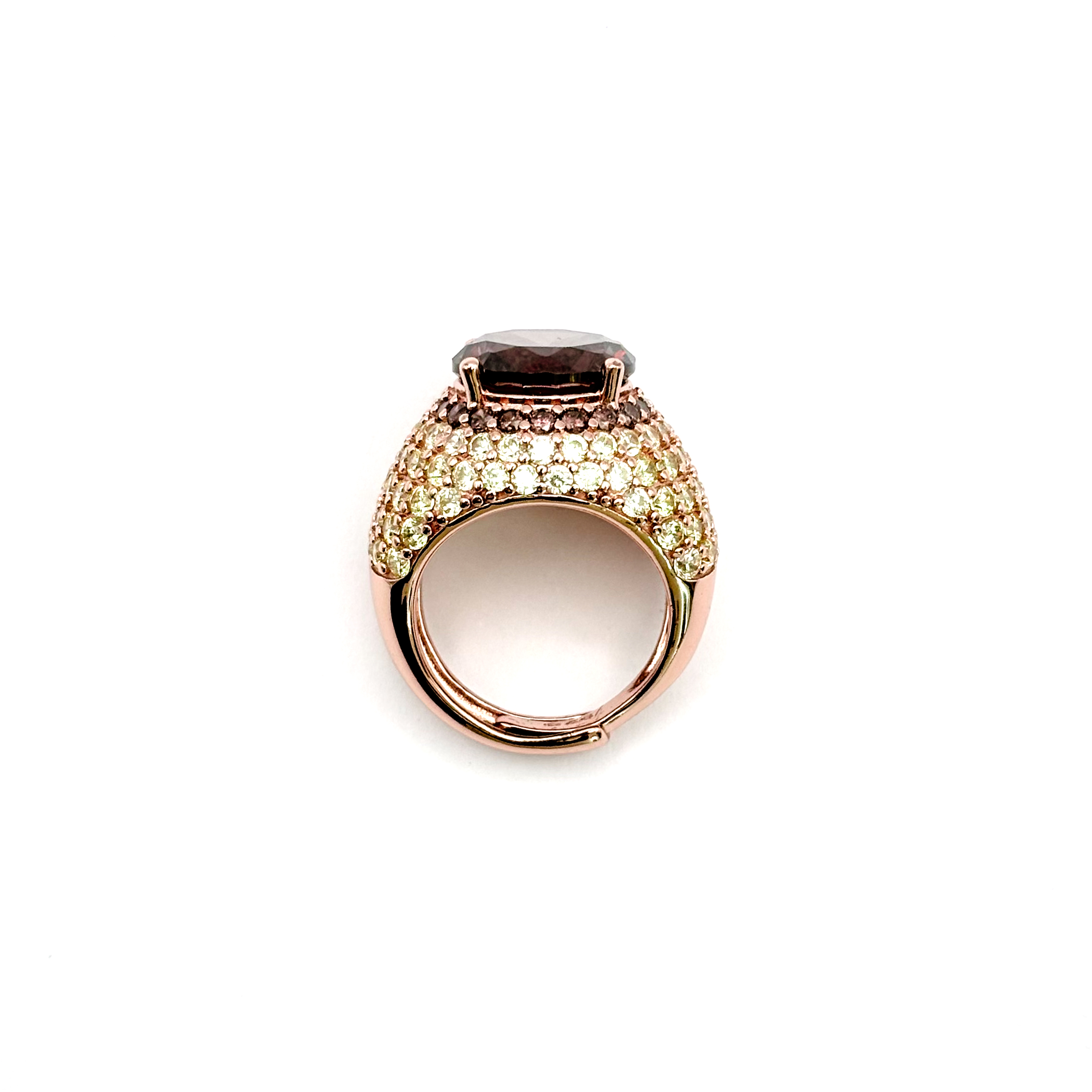 Argento 925 rosato, pietra idrotermale fumé bordeaux, zirconi bruni e zirconi lime.