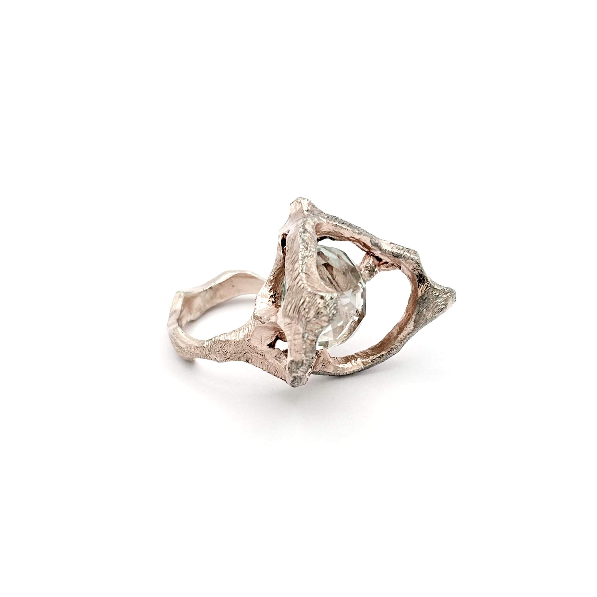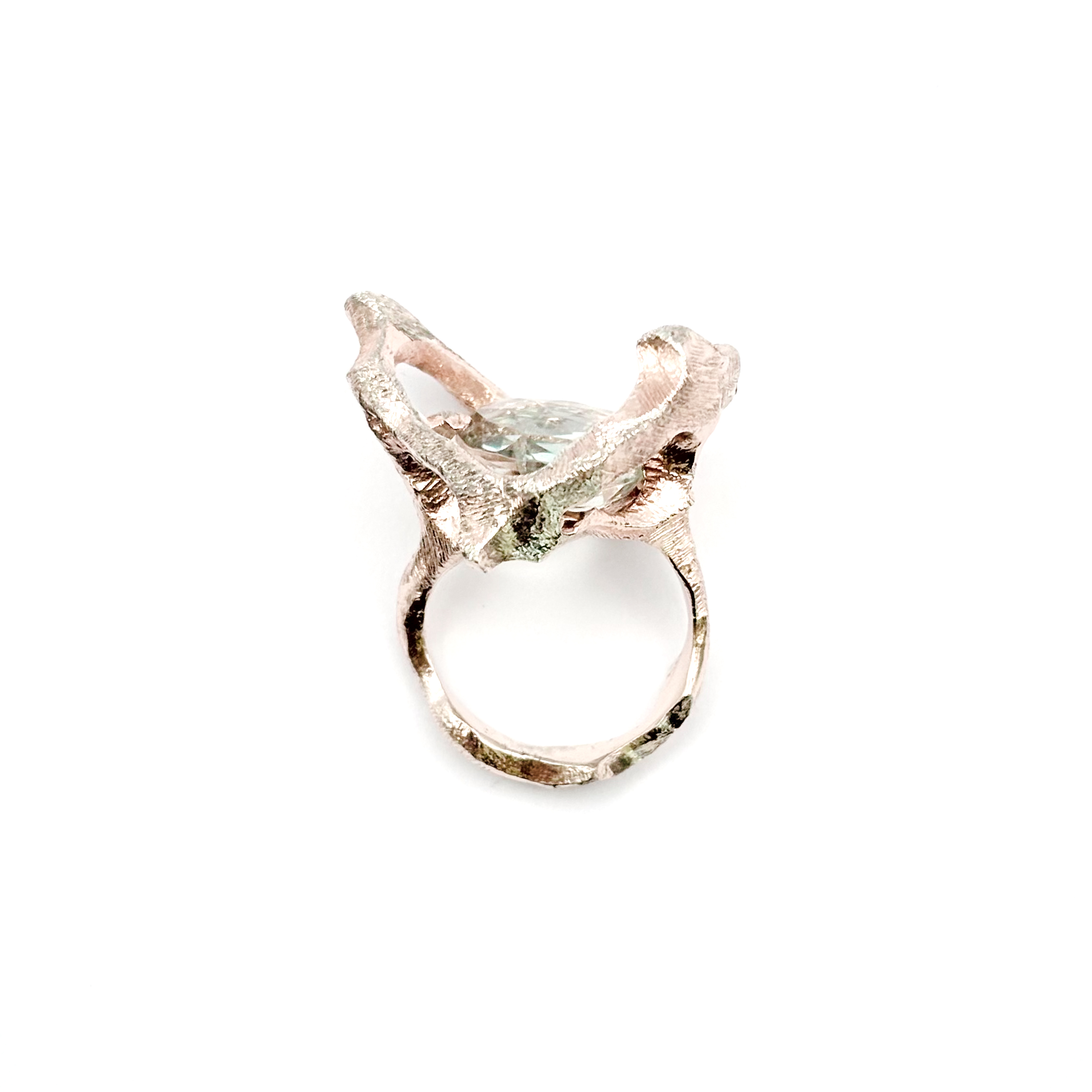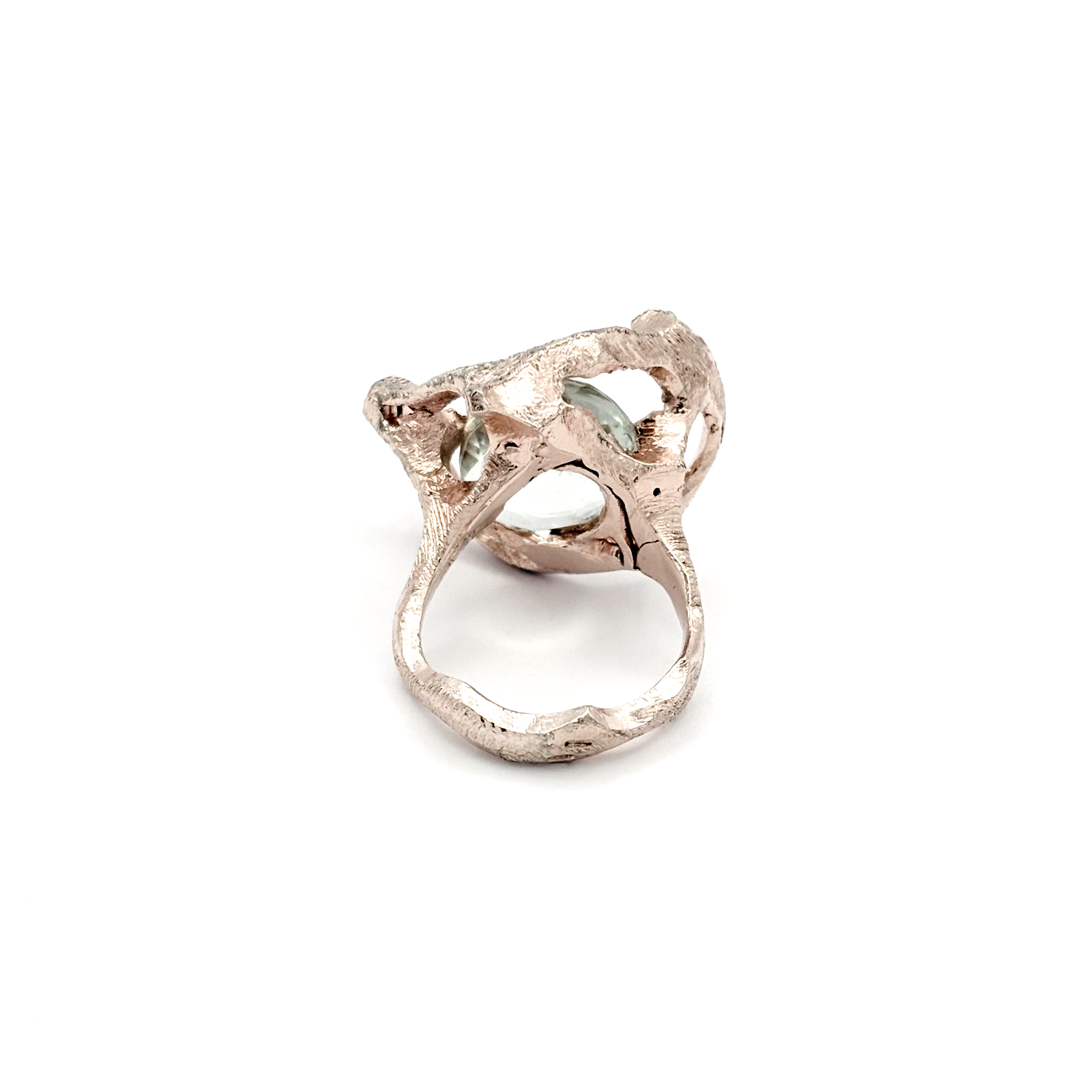 L’ispirazione è quella delle forme organiche: non perfette, ma vive. Il rosato scaldato dalla patina vintage esalta la delicatezza verde tenue della prasiolite, per un’eleganza originale e non convenzionale.
