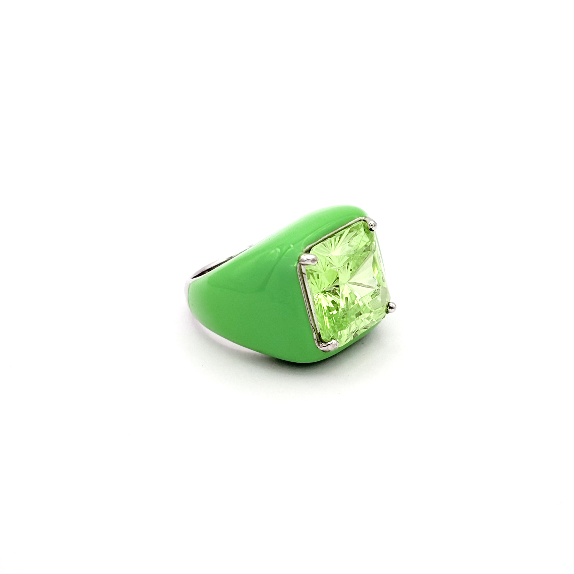 Pop ma sofisticato: il verde pieno richiama energia e freschezza, mentre la pietra sfaccettata aggiunge profondità e riflessi. È l’anello perfetto per dare un twist premium a look minimal.