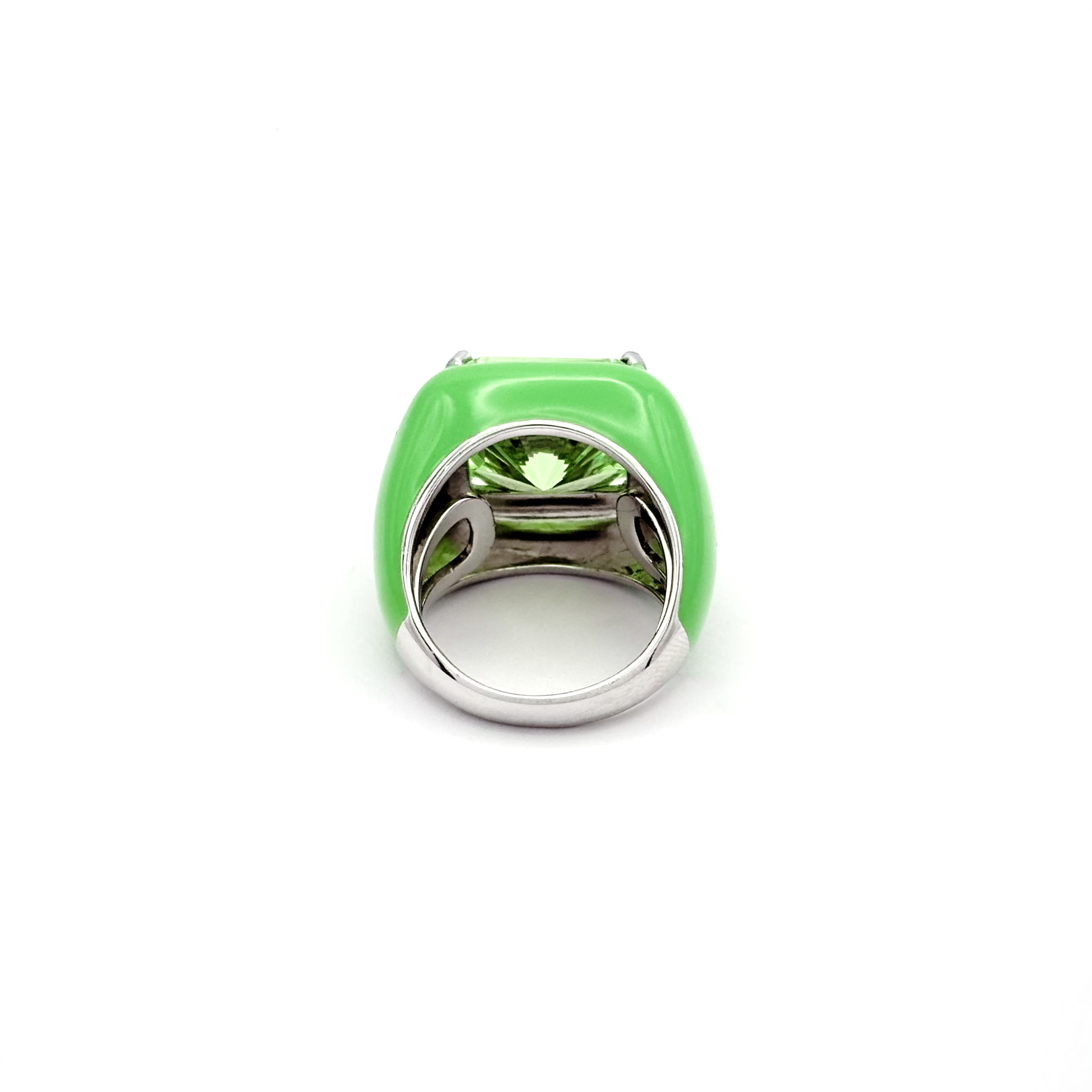 Un anello statement dal colore vibrante, pensato per chi ama i dettagli che si fanno notare con eleganza. La base in argento, sopra uno smalto verde brillante dalla finitura lucida, che incornicia una pietra idrotermale dal taglio quadrato sfaccettato, luminosa e scenografica. Il design “bold” avvolge il dito con linee morbide e contemporanee, mentre la montatura a quattro griffe valorizza la pietra con un effetto ottico pulito e moderno.