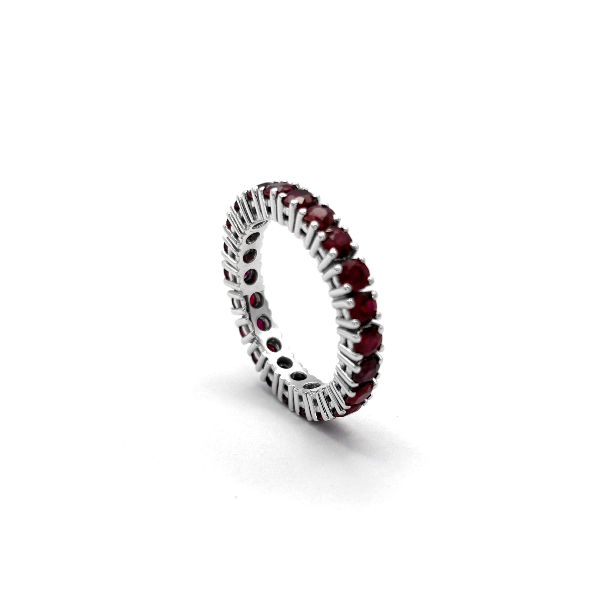 La precisione della lavorazione garantisce un’armonia perfetta tra le gemme e la struttura in oro. Ogni rubino è incastonato in modo da ottimizzarne luminosità e stabilità, creando una superficie elegante e luminosa. La tecnica utilizzata valorizza la naturale vivacità delle pietre senza appesantire il design.