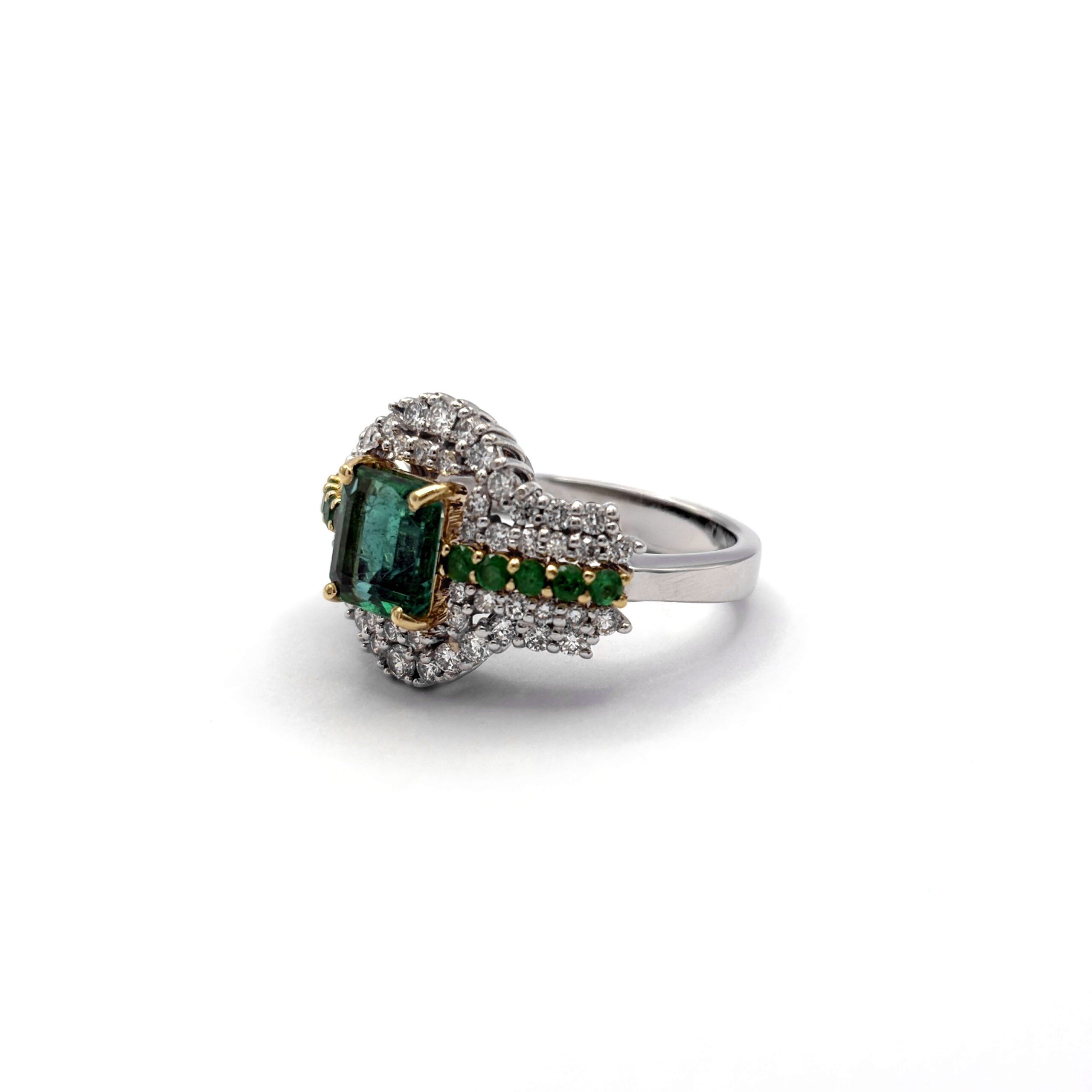 La composizione di smeraldi e diamanti crea un forte impatto visivo senza perdere eleganza. Il profilo leggermente rialzato permette di valorizzare il gioco di luce che attraversa la gemma centrale.