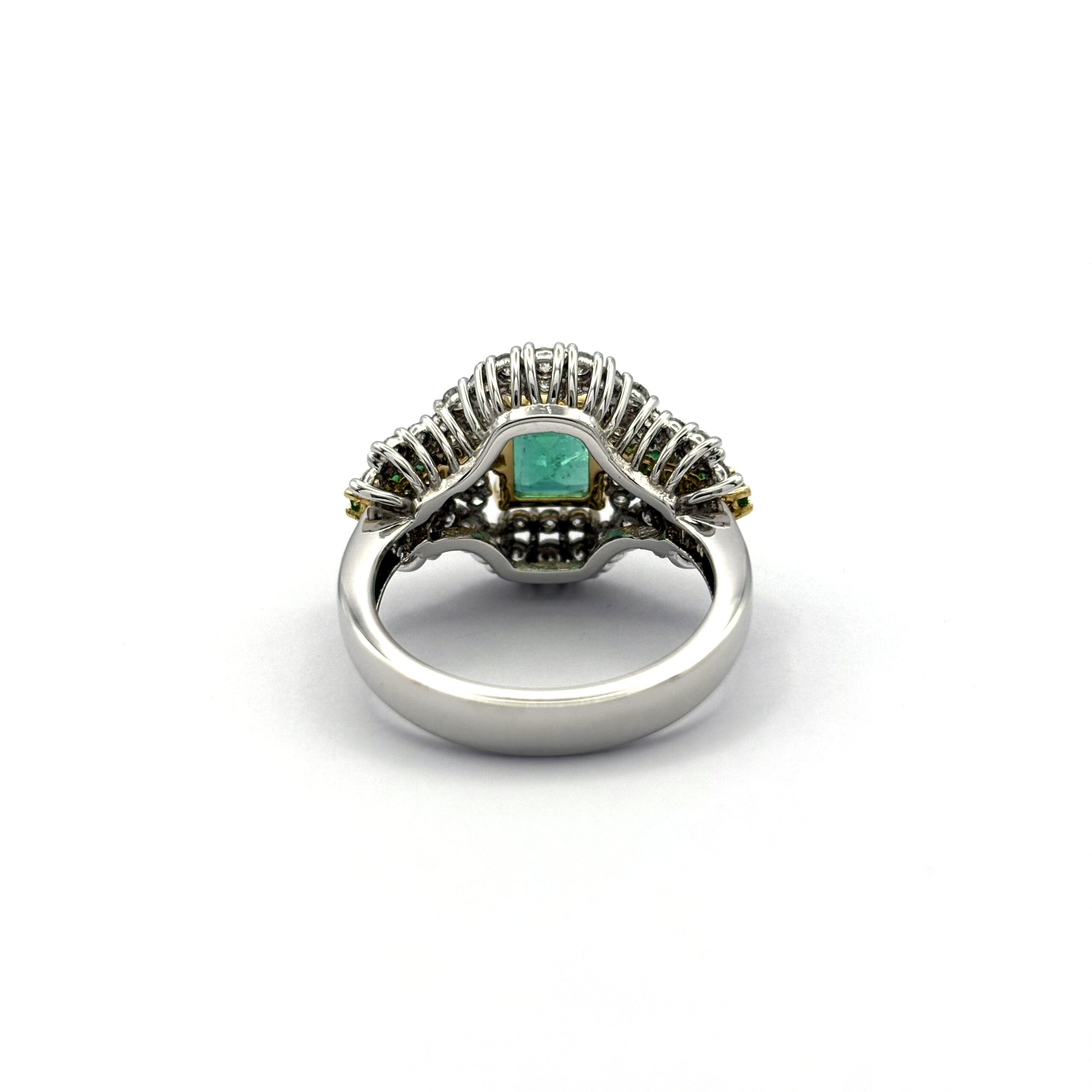 Ogni pietra è incastonata con precisione artigianale per massimizzare la luce e ottenere un risultato estetico impeccabile. L’incastonatura a contorno amplifica la grandezza visiva dello smeraldo, mentre la struttura dell’anello garantisce stabilità , comfort e un design armonioso.