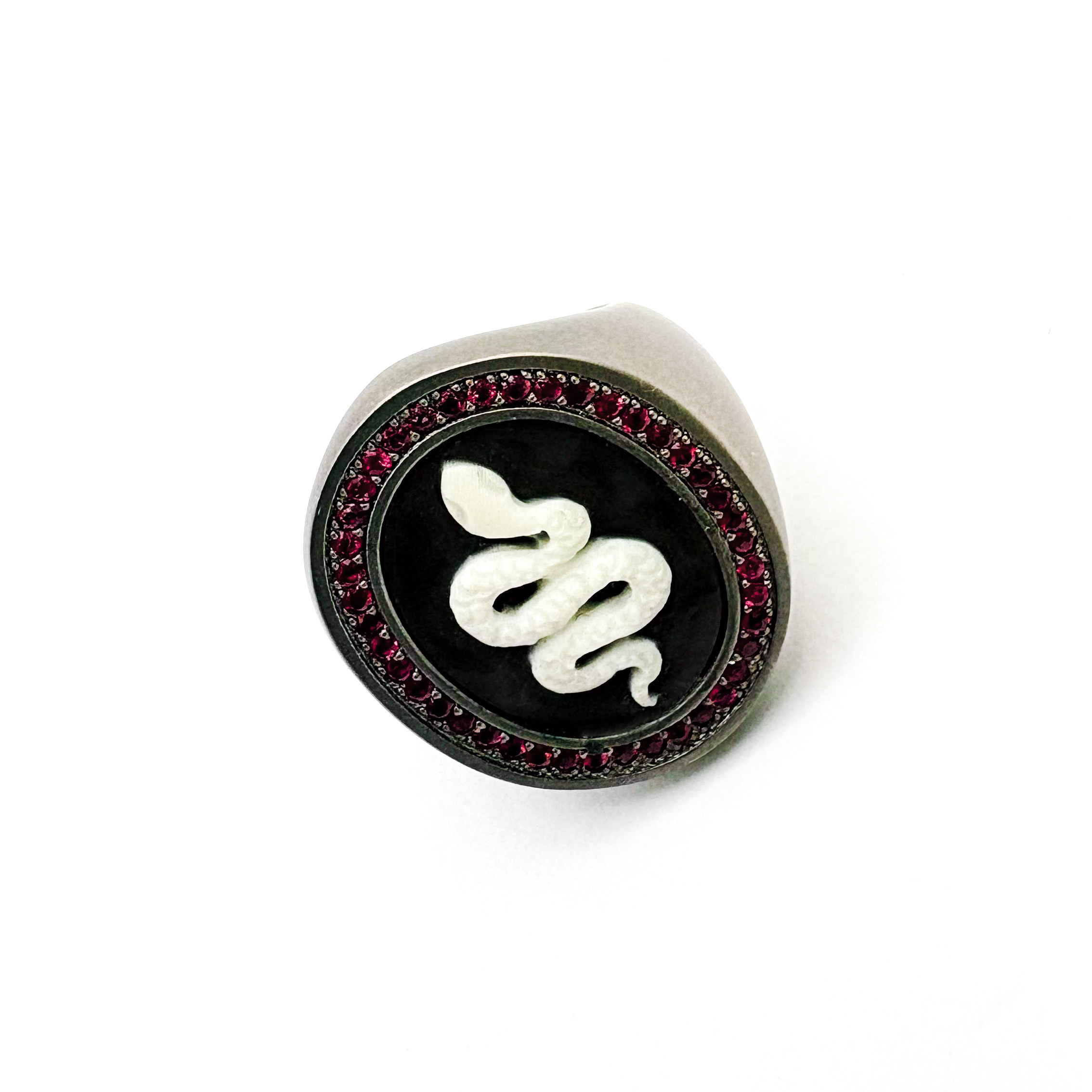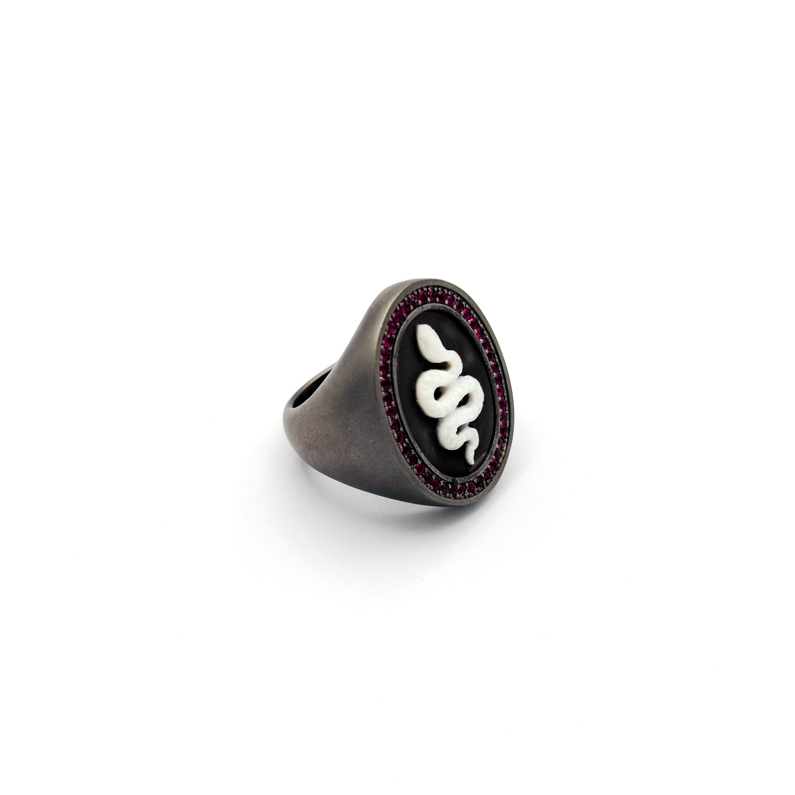 La montatura è realizzata in titanio. Al centro, un cammeo con serpente in tonalità chiara su fondo scuro, per un effetto cameo ad alto contrasto. La cornice è impreziosita da rubini per una luce rossa profonda.