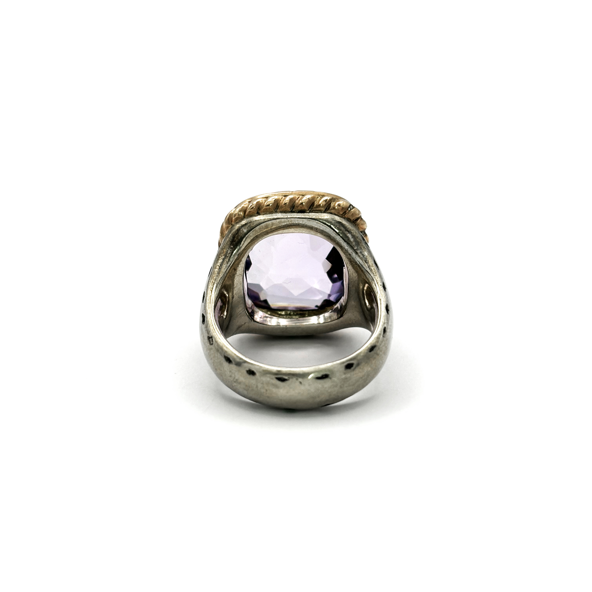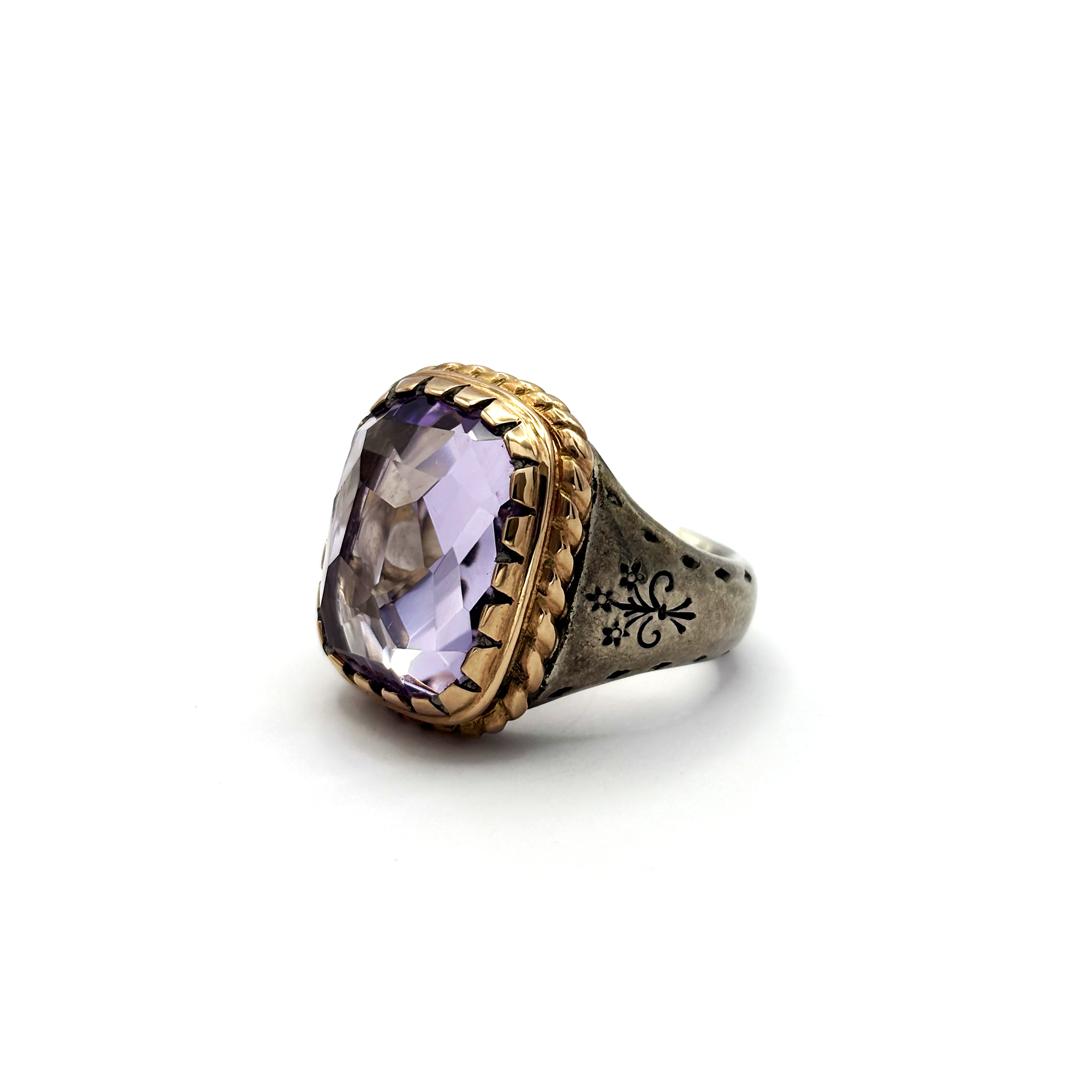 La combinazione di argento 925 e oro rosa 9 kt crea un contrasto elegante e sofisticato. L’argento offre struttura e presenza, mentre l’oro rosa aggiunge calore e un tocco femminile. La Rosa di Francia naturale, apprezzata per il suo colore rosa-lilla e per la sua luminosità delicata, viene valorizzata al massimo grazie alla montatura artigianale e alla totale assenza di trattamenti.