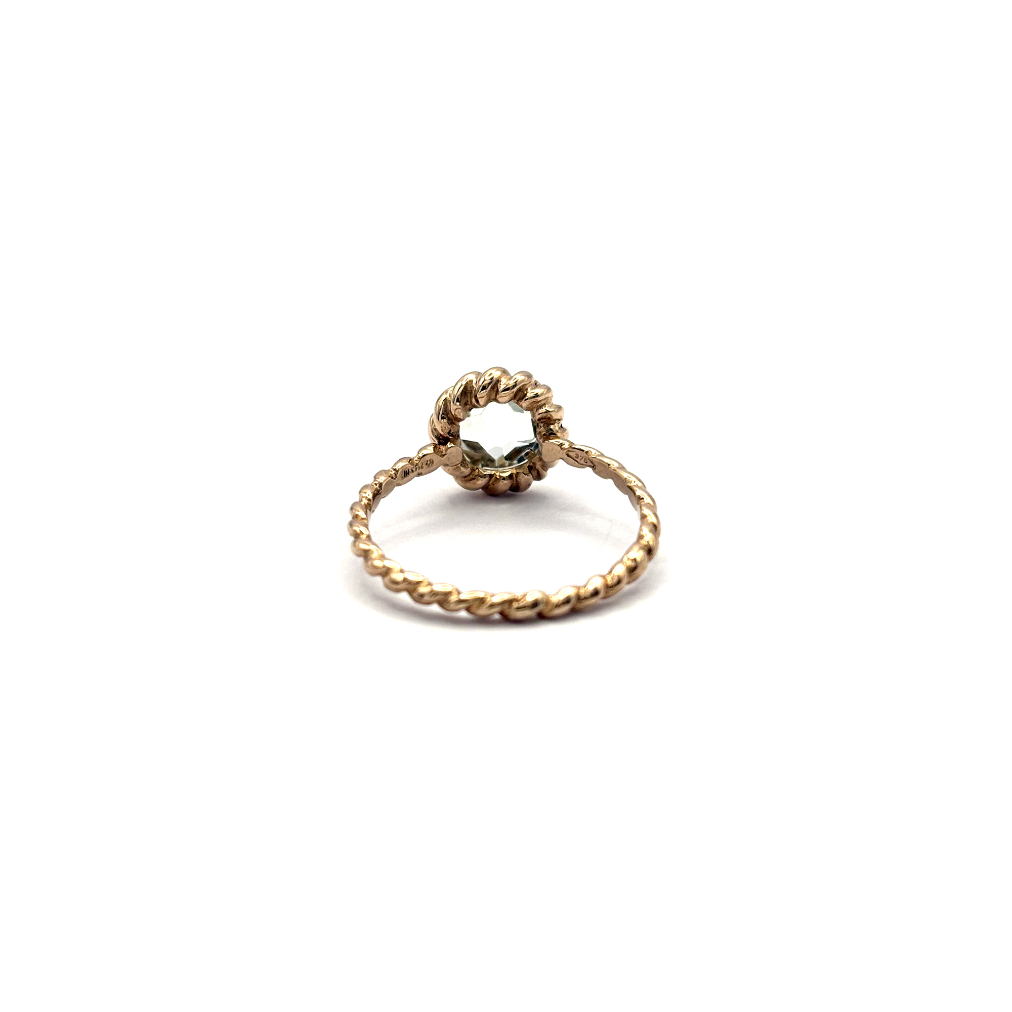 Realizzato in oro rosa 9 kt, questo anello offre una tonalità calda e luminosa che valorizza la delicatezza cromatica della prasiolite. La pietra, completamente naturale e dal taglio sfaccettato, riflette la luce con discrezione, donando un effetto brillante ma mai eccessivo.