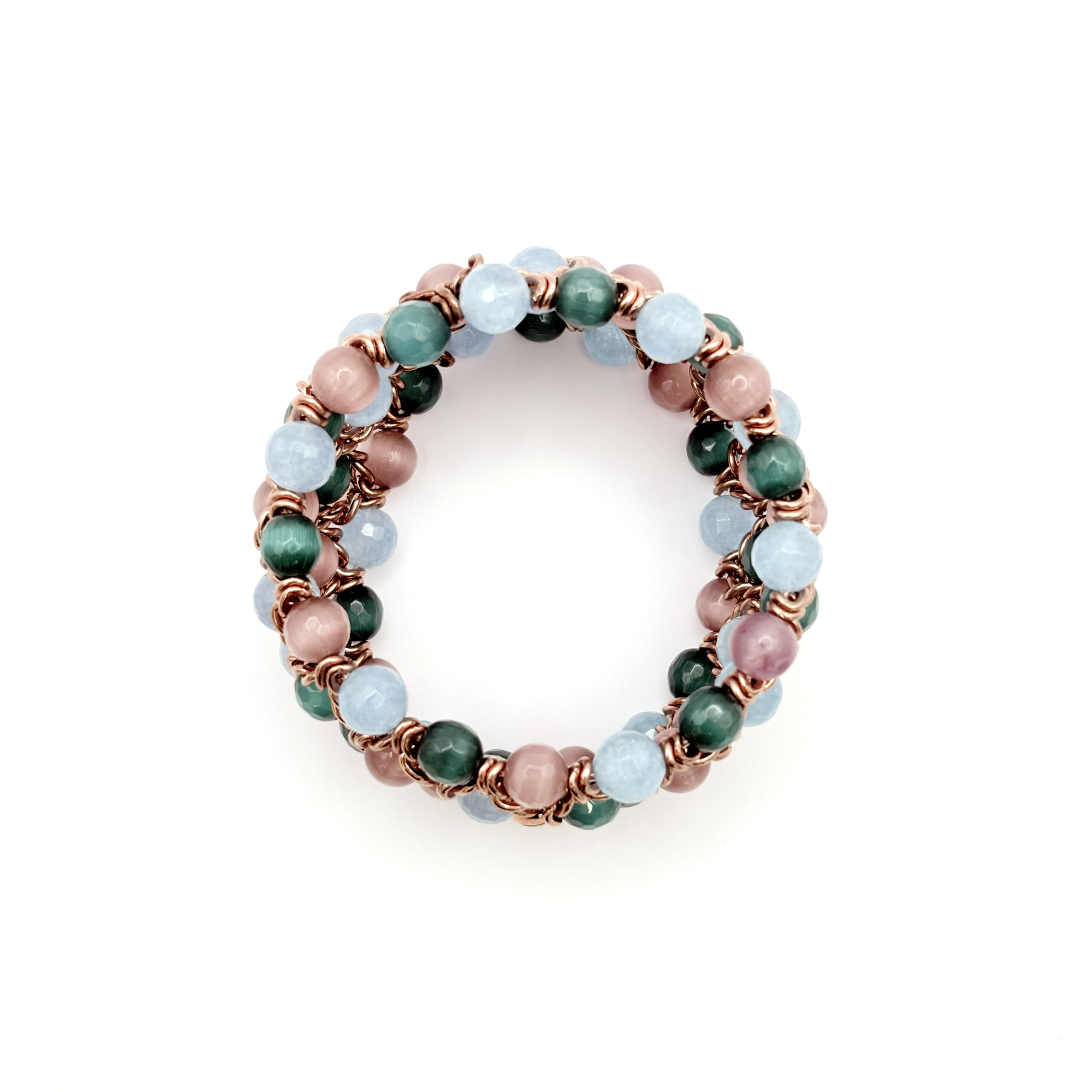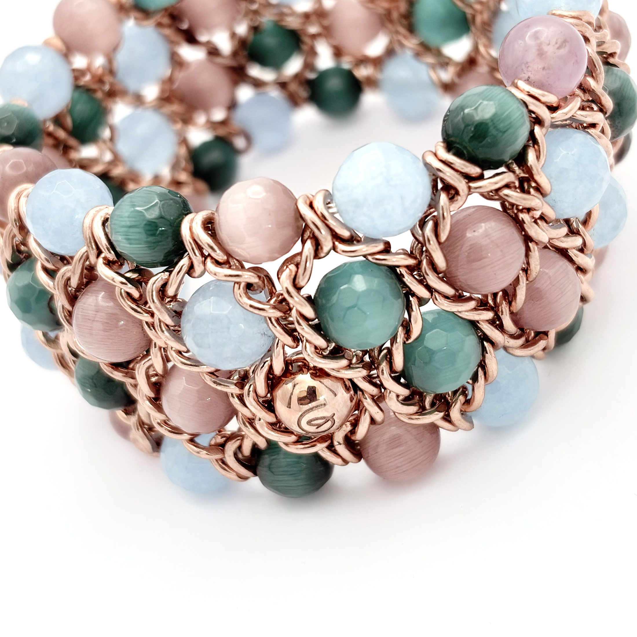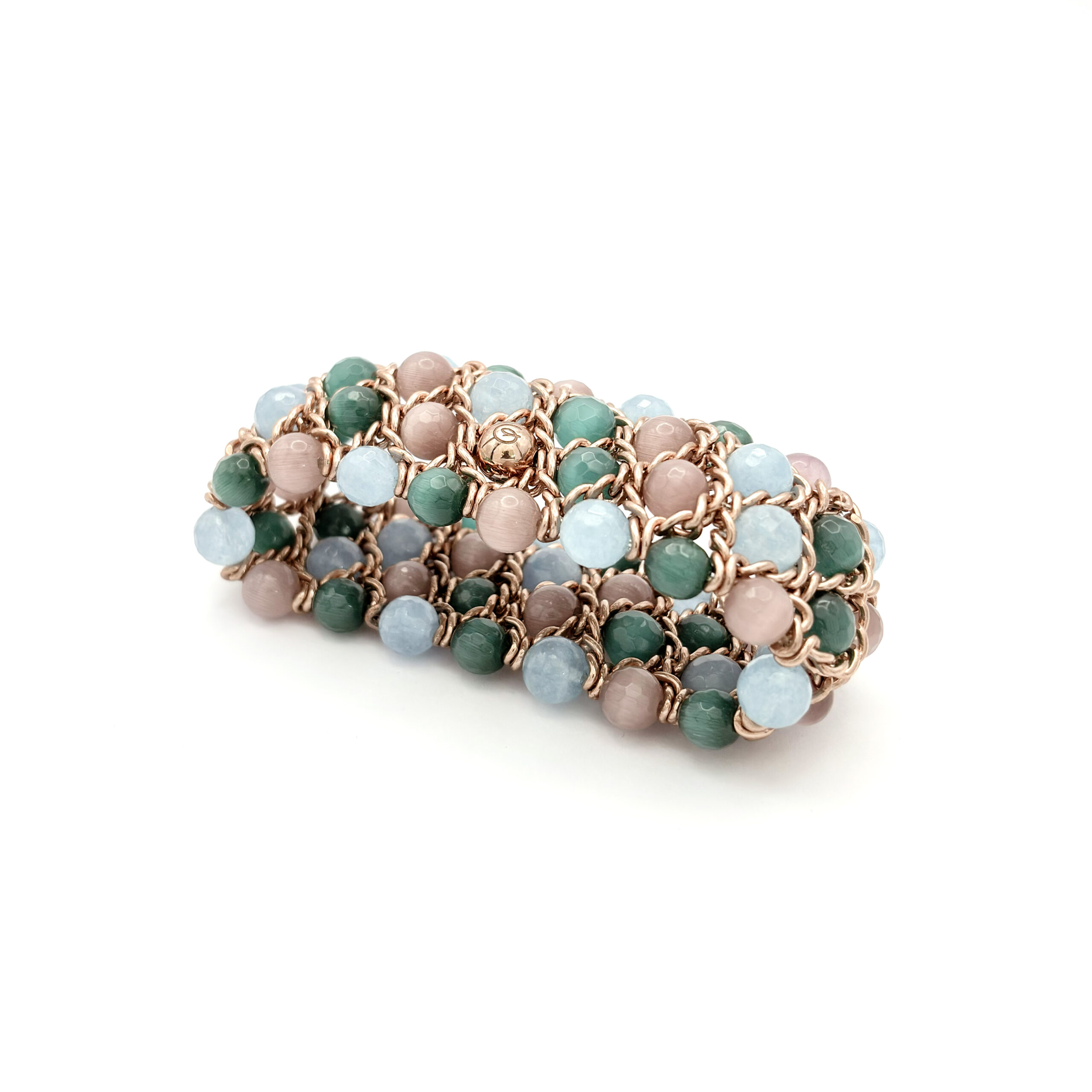 Un bracciale elastico che illumina il polso con una maglia intrecciata color oro rosa e una palette fresca di pietre naturali: azzurro, verde e rosa cipria. Il volume a rete crea una presenza elegante ma morbida, con sfere alternate tra finiture lisce e dettagli sfaccettati che catturano la luce con discrezione. Si indossa in un gesto, senza chiusure, e regala subito un tocco premium anche al look più semplice.