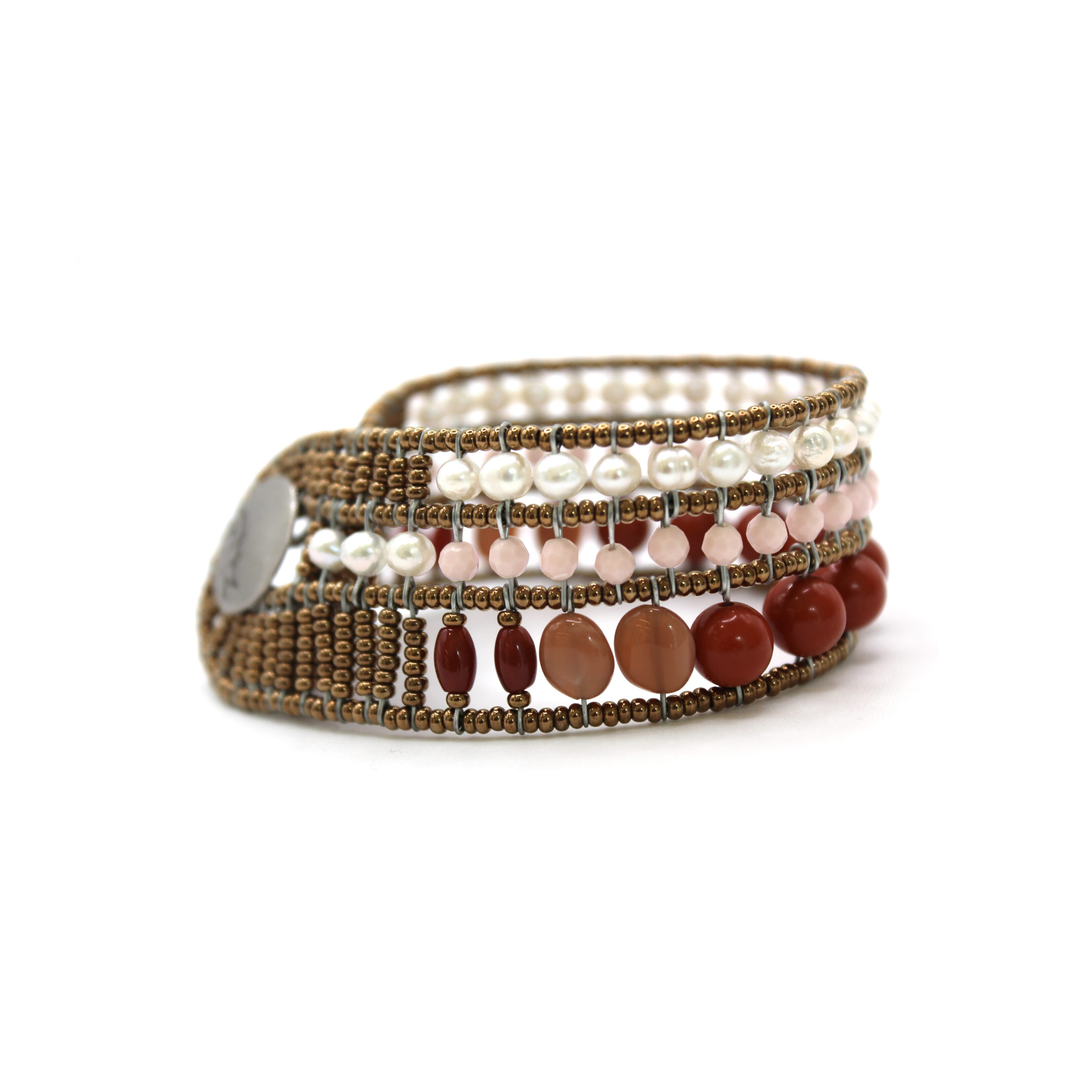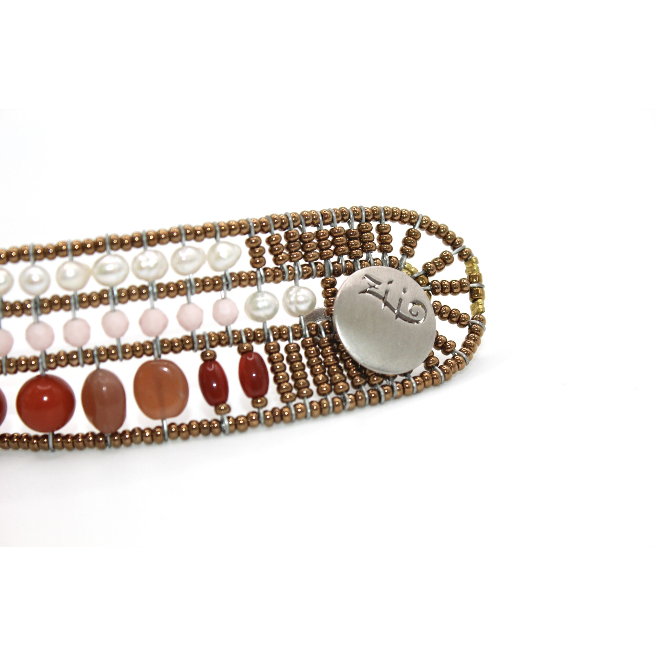 Realizzato in argento 925, il bracciale offre una base luminosa e resistente che valorizza la varietà delle pietre naturali. La corniola regala calore e vitalità , le pietre di luna aggiungono riflessi morbidi e iridescenti, mentre le perle di vetro di Murano e le perle d’acqua dolce completano il design con eleganza e leggerezza.