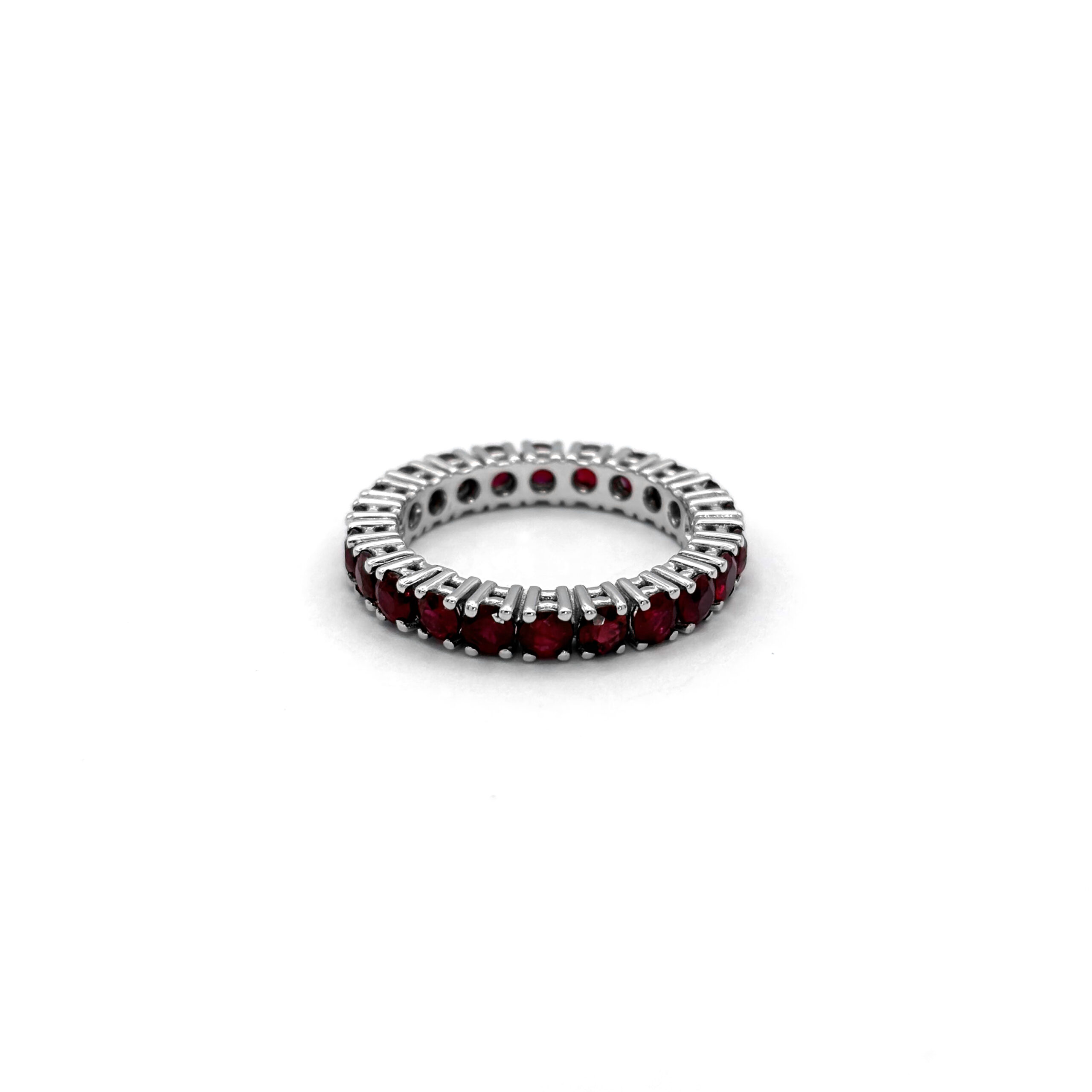 La finitura satinata valorizza le curve e rende l’insieme estremamente attuale. L’incastonatura a filo lungo il profilo evidenzia la continuità del cerchio.