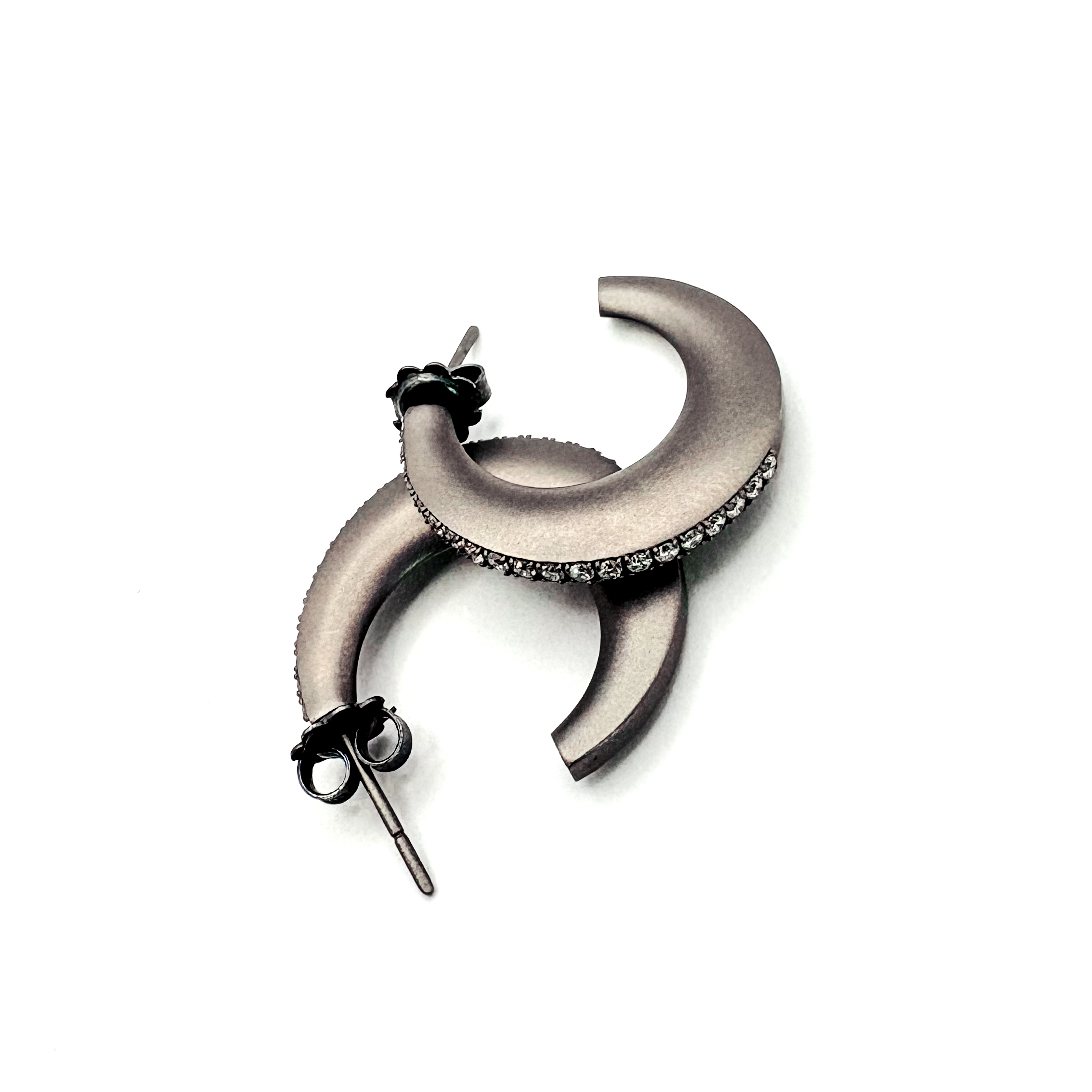 Essenziali e magnetici, questi orecchini a cerchio in titanio Mano|J. reinterpretano la forma lunare con un design pieno, pulito e contemporaneo. Il profilo satinato esalta la tonalità grigio fumo del metallo, mentre una linea di pietre crea un punto luce discreto ma deciso. Perfetti per chi ama i gioielli moderni, leggeri e di carattere, da indossare ogni giorno con un’eleganza non convenzionale.
