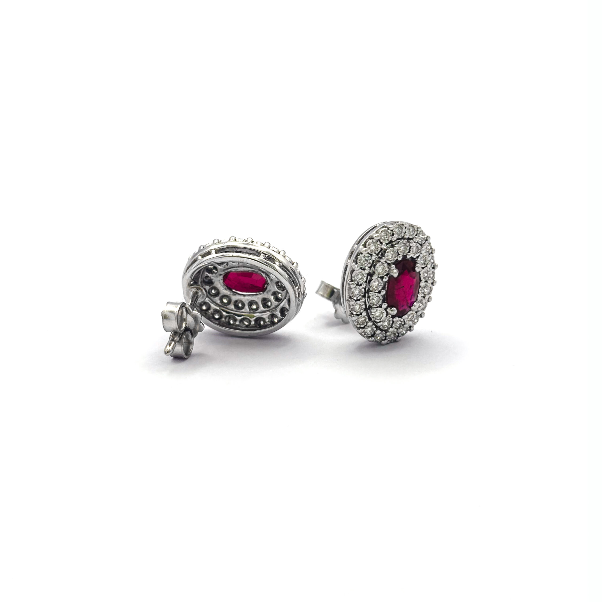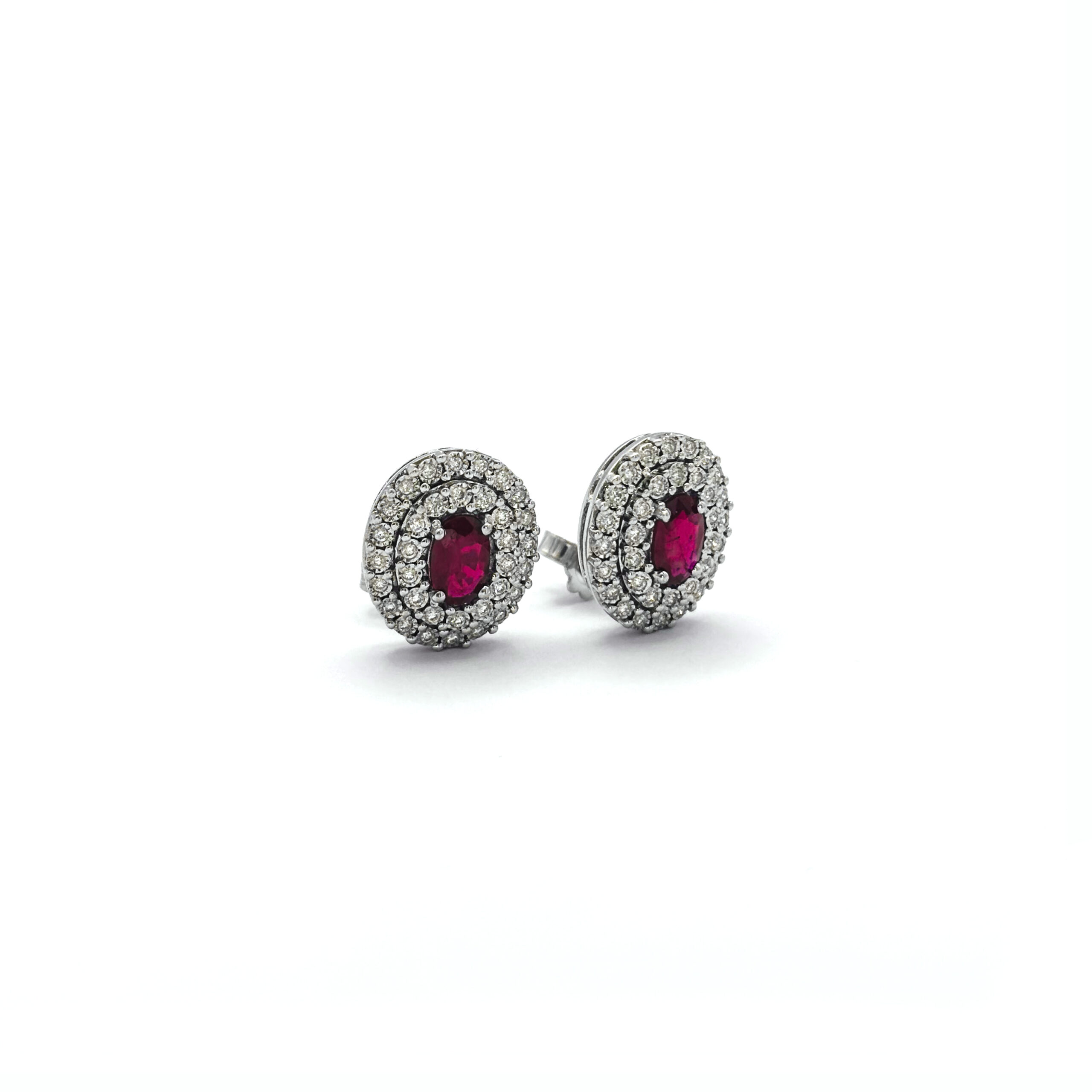 La caratura dei rubini (1,03 ct totali) conferisce un punto colore deciso; i diamanti (0,27 ct totali, colore G, purezza VS) aggiungono una luce pulita e brillante. La chiusura a farfallina garantisce sicurezza e praticità.