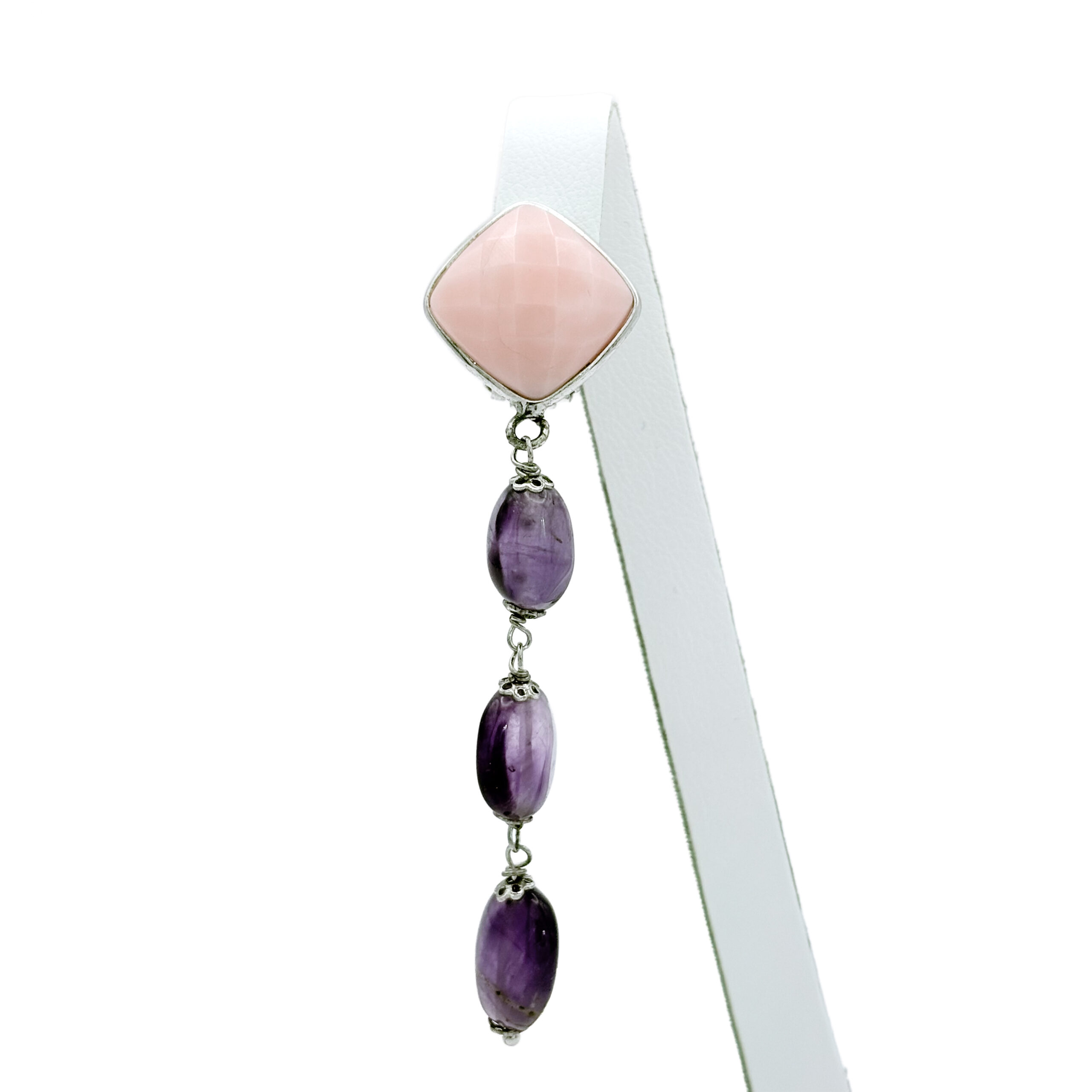 Argento 925 lucido, opale rosa centrale (elemento superiore) e ametista in tre pietre pendenti. L’accostamento cromatico è armonioso e molto chic.