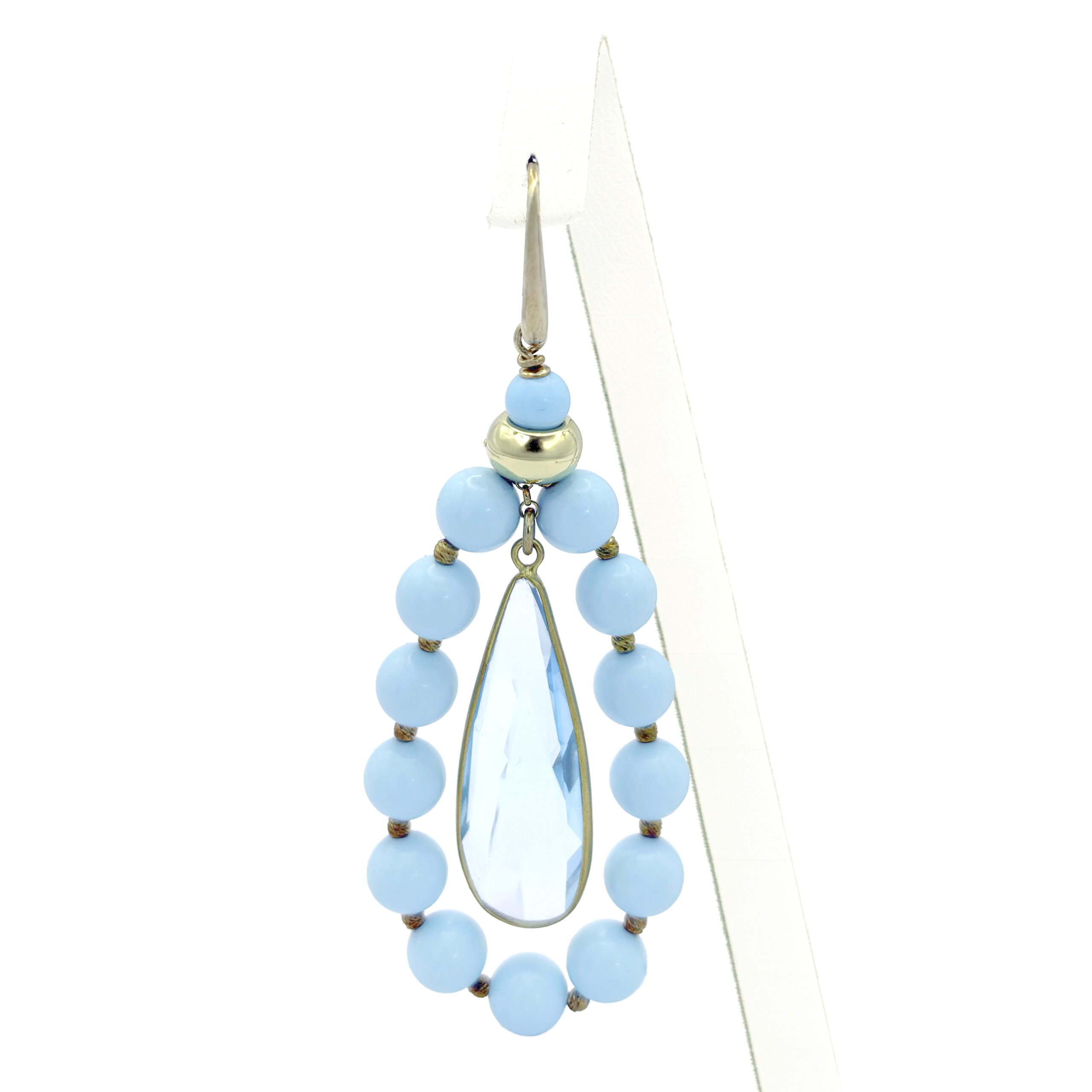 Base in argento 925 dorato, con sfere di turchese e cristallo centrale color azzurro. Il design riflette l’attenzione del brand per estetica, gusto e scelta dei materiali.