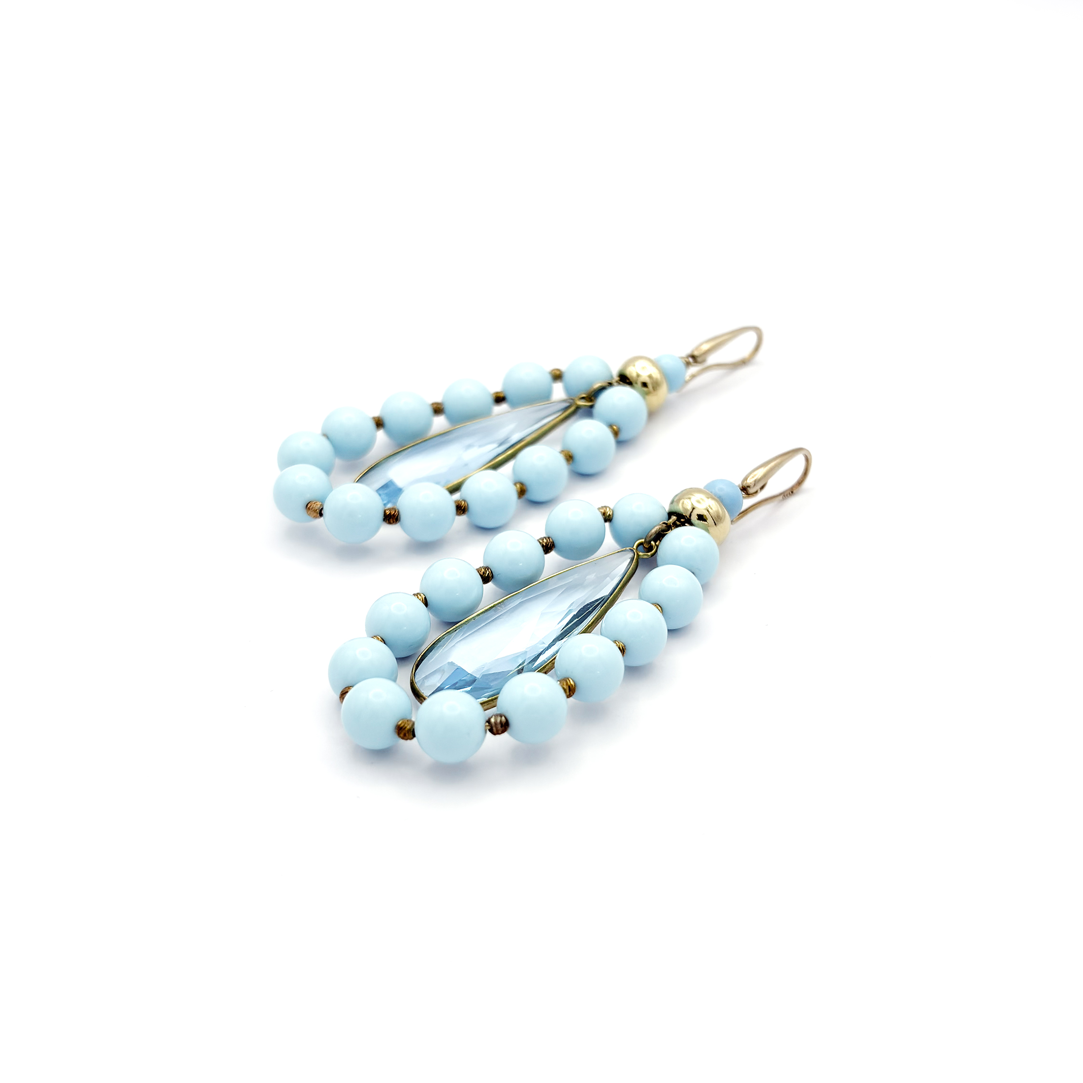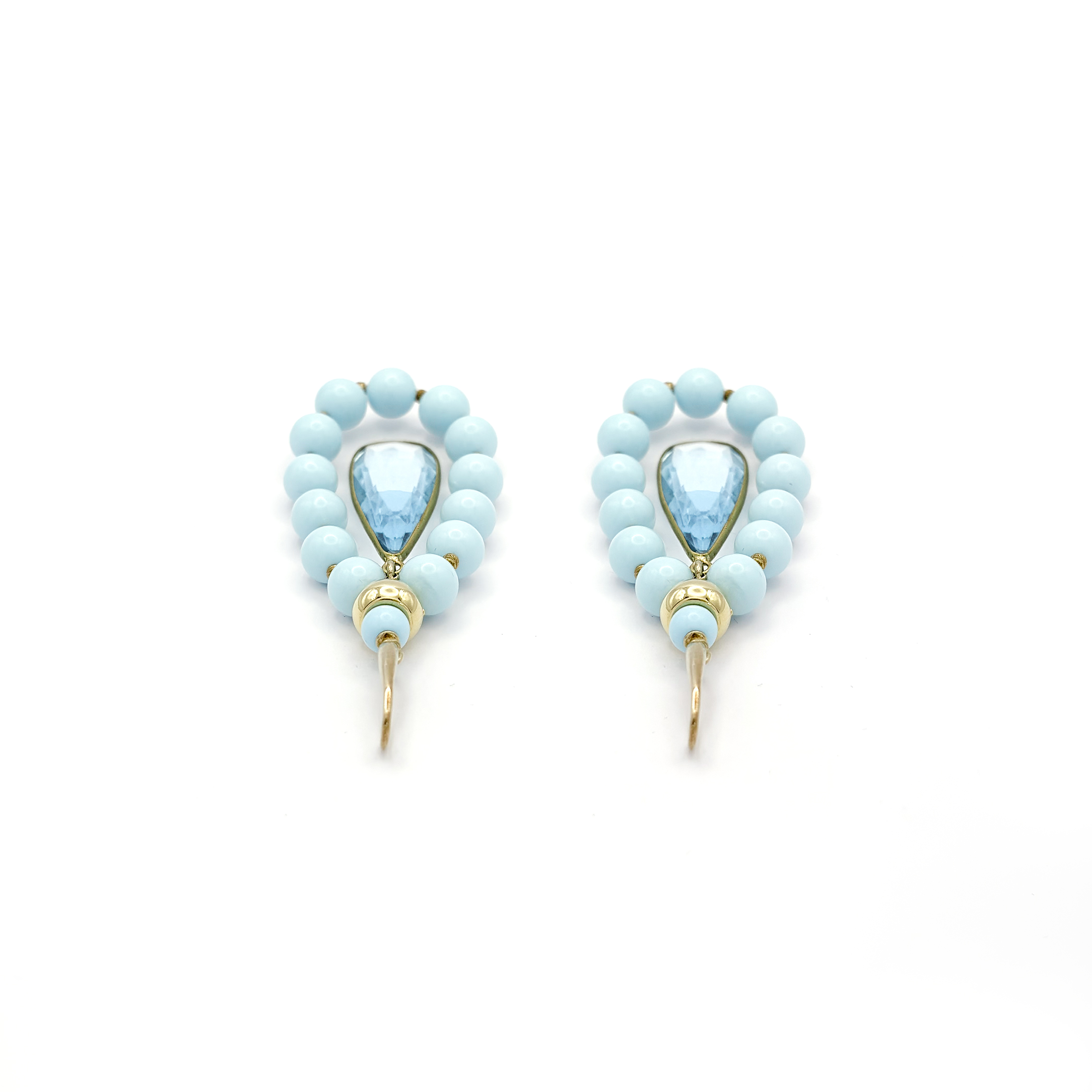 Orecchini pendenti in argento 925 dorato firmati Giadan: una silhouette a goccia luminosa, incorniciata da sfere di turchese color cielo e completata da un cristallo sfaccettato centrale. I dettagli dorati scaldano la composizione e creano un contrasto raffinato con le nuance azzurre, per un effetto elegante e fresco, perfetto in ogni stagione.